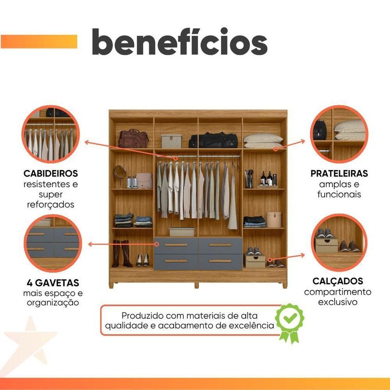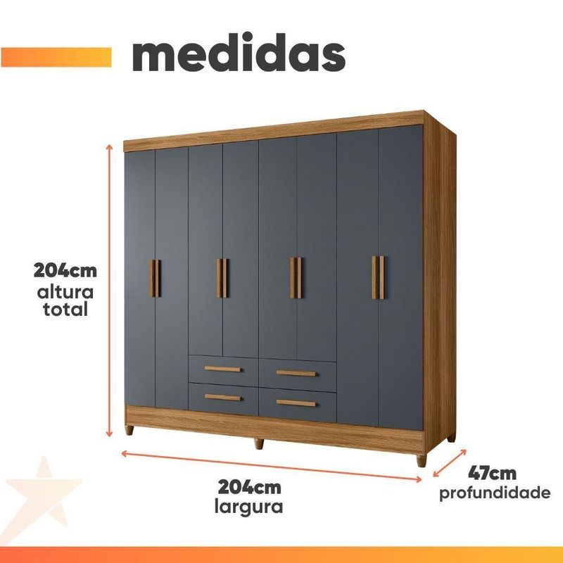 Guarda Roupas Casal 8 Portas 4 Gavetas Montana Madeirado / CinzaO guarda roupas Montana conta com 8 portas que proporcionam acesso facilitado a todos os compartimentos internos. As 4 gavetas externas, equipadas com corrediças que deslizam suavemente e garantem espaço extra para armazenar itens pessoais com comodidade. Os cabideiros em alumínio oferecem resistência e durabilidade para acomodar roupas, mantendo tudo sempre bem organizado. Internamente, ele surpreende pelas ótimas distribuições dos espaços, as amplas prateleiras são ideais para armazenar itens volumosos com facilidade. Além disso, oferece espaço para calçados ou objetos do dia a dia, permitindo que tudo fique sempre organizado e visível e ao seu alcance. Um móvel completo quem busca praticidade, elegância com design moderno para o quarto.MEDIDAS:A = 204 cmL = 204 cmP = 47 cmMEDIDAS DOS PÉS:A = 7 cmL = 5 cmP = 5 cmPESO: 116,9 kgPESO SUPORTADO: 84 kgPRATELEIRAS SUPORTAM ATÉ: 6 kgGAVETAS SUPORTAM ATÉ: 6 kgCABIDEIROS SUPORTAM ATÉ: 6 kgMODELO: Guarda Roupas Casal 8 Portas 4 Gavetas MontanaMARCA: MovalPINTURA: UV de alta qualidadeACABAMENTO: FoscoMATERIAL DA ESTRUTURA: MDPESPESSURA DO MATERIAL DA ESTRUTURA: 12 mmPORTAS: 8TIPO DE PORTA: BaterDOBRADIÇAS: MetálicasGAVETAS: 4CORREDIÇAS: MetálicasPRATELEIRAS: 8 espaçosasCABIDEIROS: 2MATERIAL DO CABIDEIRO: AlumínioPUXADORES: 12MATERIAL DOS PUXADORES: MDFQUANTIDADE DE PÉS: 6MATERIAL DOS PÉS: PVCDIFERENCIAL: Amplo espaço interno para melhor armazenamento / Pés em PVC facilitando a limpeza / Puxadores em MDF / Pintura UV de alta qualidade.INSTRUÇÕES E CUIDADOS: Para maior durabilidade, recomendável que a limpeza dos móveis seja feita com pano limpo e seco. Não usar produtos químicos ou abrasivos.GARANTIA: 6 meses pelo fabricante.Importante sobre a : A é realizada até a portaria ou porta de entrada do indicado, desde que o acesso seja permitido. Para locais com portaria, a será feita no piso térreo. Não realizamos montagem, desmontagem, por escadas ou içamento. É responsabilidade do cliente verificar se as dimensões do produto são compatíveis com portas, elevadores e corredores. Evite imprevistos: confira todos os detalhes antes de concluir sua compra. MEDIDAS:: A = 204 cm L = 204 cm P = 47 cm | MEDIDAS DOS PÉS:: A = 7 cm L = 5 cm P = 5 cm | PESO:: 116,9 kg | PESO SUPORTADO:: 84 kg | PRATELEIRAS SUPORTAM ATÉ:: 6 kg | GAVETAS SUPORTAM ATÉ:: 6 kg | CABIDEIROS SUPORTAM ATÉ:: 6 kg | MODELO:: Guarda Roupas Casal 8 Portas 4 Gavetas Montana | MARCA:: Moval | PINTURA:: UV de alta qualidade | ACABAMENTO:: Fosco | MATERIAL DA ESTRUTURA:: MDP | ESPESSURA DO MATERIAL DA ESTRUTURA:: 12 mm | PORTAS:: 8 | TIPO DE PORTA:: Bater | DOBRADIÇAS:: Metálicas | GAVETAS:: 4 | CORREDIÇAS:: Metálicas | PRATELEIRAS:: 8 espaçosas | CABIDEIROS:: 2 | MATERIAL DO CABIDEIRO:: Alumínio | PUXADORES:: 12 | MATERIAL DOS PUXADORES:: MDF | QUANTIDADE DE PÉS:: 6 | MATERIAL DOS PÉS:: PVC | DIFERENCIAL:: Amplo espaço interno para melhor armazenamento / Pés em PVC facilitando a limpeza / Puxadores em MDF / Pintura UV de alta qualidade. | INSTRUÇÕES E CUIDADOS:: Para maior durabilidade, recomendável que a limpeza dos móveis seja feita com pano limpo e seco. Não usar produtos químicos ou abrasivos. | GARANTIA:: 6 meses pelo fabricante. | AVISO:: Importante sobre a : A é realizada até a portaria ou porta de entrada do indicado, desde que o acesso seja permitido. Para locais com portaria, a será feita no piso térreo. | Altura: 204 | Inclui manual de montagem: Sim | Largura: 204 | Profundidade: 47 | Requer montagem: Sim | Cor: Madeirado / Cinza