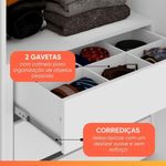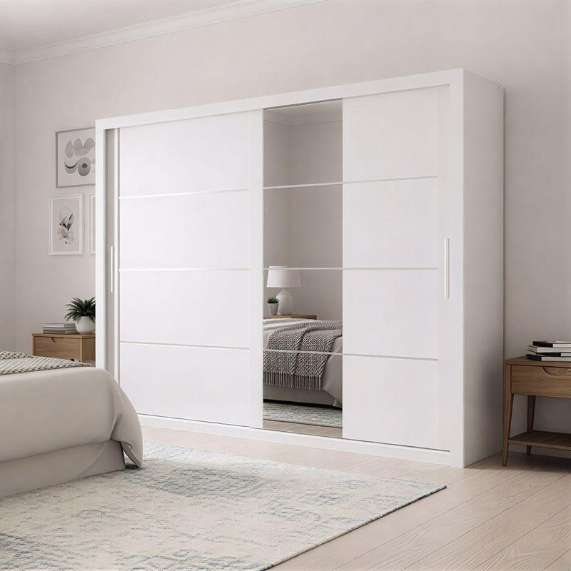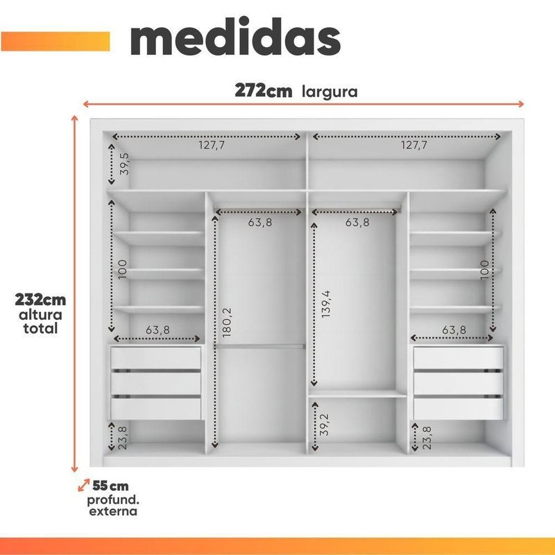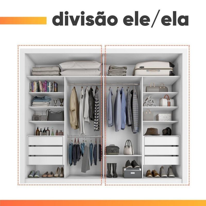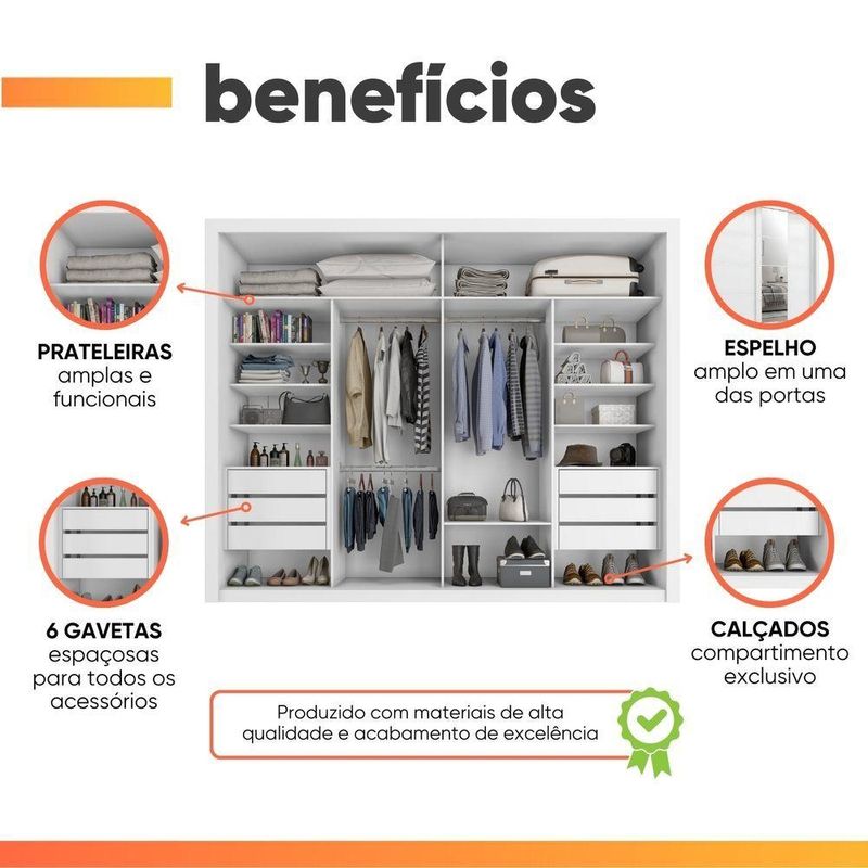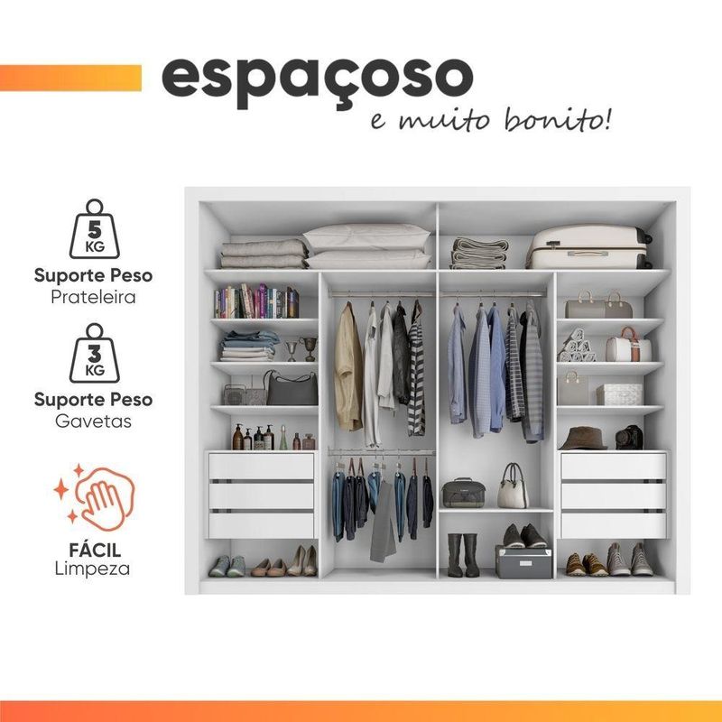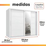 Guarda Roupas Casal Com Espelho 2 Portas De Correr 6 Gavetas Modena BrancoO Guarda Roupa Modena foi desenvolvido para aliar praticidade e elegância, proporcionando um espaço amplo e bem distribuído para organizar suas roupas, edredons, travesseiros e calçados com eficiência. Seu design moderno e sofisticado conta com duas portas de correr, sendo uma delas com um espelho amplo, agregando funcionalidade e sofisticação ao ambiente. Com seis gavetas espaçosas, as duas primeiras de cada lado possuem divisórias inteligentes, para armazenar pequenos itens com mais organização. Além disso, suas corrediças telescópicas garantem uma abertura suave e completa, proporcionando mais conforto no uso diário! O Guarda Roupa Modena é a escolha perfeita para quem busca beleza, qualidade e durabilidade em um único móvel.MEDIDAS:[ A ] = 232 cm[ L ] = 272,5 cm[ P ] = 55,3 cmMEDIDAS DE CADA ESPELHO (4 Lâminas):[ A ] = 53,3 cm[ L ] = 57,4 cm[ P ] = 0,3 cmPESO: 225,8 kgPESO SUPORTADO: 80 kgGAVETAS SUPORTAM ATÉ: 3 kgPRATELEIRAS SUPORTAM ATÉ: 5 kgCABIDEIRO SUPORTA ATÉ: 5 kgMODELO: Guarda Roupas Casal com Espelho 2 Portas 6 Gavetas ModenaMARCA: ZanziniTIPO DE PINTURA: FoscoACABAMENTO: TexturizadoMATERIAL: MDPESPESSURA DO MATERIAL: 15mmPORTAS: 2 (Portas de correr)POSSUI ESPELHO: Sim (4 Lâminas)GAVETAS: 6 (2 primeiras com divisória)PRATELEIRAS: 7QUANTIDADE DE CABIDEIRO: 3CABIDEIROS: MetálicosCORREDIÇAS: TelescópicasPUXADOR: MDFGARANTIA: 3 MesesDIFERENCIAL: Duas gavetas com divisórias organizadoras, corrediça telescópicas, porta com amplo espelho.SISTEMA DE MONTAGEM: Parafusos auto atarraxantes, cola, cavilhas, pregos, minifixImportante sobre a entrega: A entrega é realizada até a portaria ou porta de entrada do endereço indicado, desde que o acesso seja permitido. Para locais com portaria, a entrega será feita no piso térreo. Não realizamos montagem, desmontagem, transporte por escadas ou içamento. É responsabilidade do cliente verificar se as dimensões do produto são compatíveis com portas, elevadores e corredores. Evite imprevistos: confira todos os detalhes antes de concluir sua compra. MEDIDAS:: [ A ] = 232 cm [ L ] = 272,5 cm [ P ] = 55,3 cm | MEDIDAS DE CADA ESPELHO (4 Lâminas):: [ A ] = 53,3 cm [ L ] = 57,4 cm [ P ] = 0,3 cm | PESO:: 225,8 kg | PESO SUPORTADO:: 80 kg | GAVETAS SUPORTAM ATÉ:: 3 kg | PRATELEIRAS SUPORTAM ATÉ:: 5 kg | CABIDEIRO SUPORTA ATÉ:: 5 kg | TIPO DE PINTURA:: Fosco | ACABAMENTO:: Texturizado | MODELO:: Guarda Roupas Casal com Espelho 2 Portas 6 Gavetas Modena | MARCA:: Zanzini | MATERIAL:: MDP | ESPESSURA DO MATERIAL:: 15mm | POSSUI ESPELHO:: Sim (8 Lâminas) | PRATELEIRAS:: 7 | QUANTIDADE DE CABIDEIRO:: 3 | CABIDEIROS:: Metálicos | CORREDIÇAS:: Telescópicas | PUXADOR:: MDF | GARANTIA:: 3 Meses | DIFERENCIAL:: Duas gavetas com divisórias organizadoras, corrediça telescópicas, porta com amplo espelho. | SISTEMA DE MONTAGEM:: Parafusos auto atarraxantes, cola, cavilhas, pregos, minifix | AVISO:: Importante sobre a entrega: A entrega é realizada até a portaria ou porta de entrada do endereço indicado, desde que o acesso seja permitido. Para locais com portaria, a entrega será feita no piso térreo. | PORTAS:: 2 (Portas de correr) | GAVETAS:: 6 (2 primeiras com divisória) | Altura: 232 cm | Largura: 272,5 cm | Profundidade: 55,3 cm | Requer montagem: Sim | Altura da embalagem: 42 cm | Comprimento da embalagem: 265 cm | Largura da embalagem: 58 cm | Peso da embalagem: 21225 g | Cor: Branco