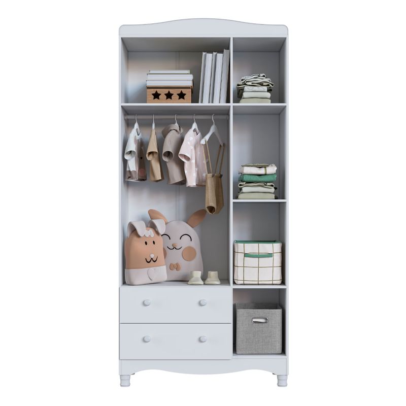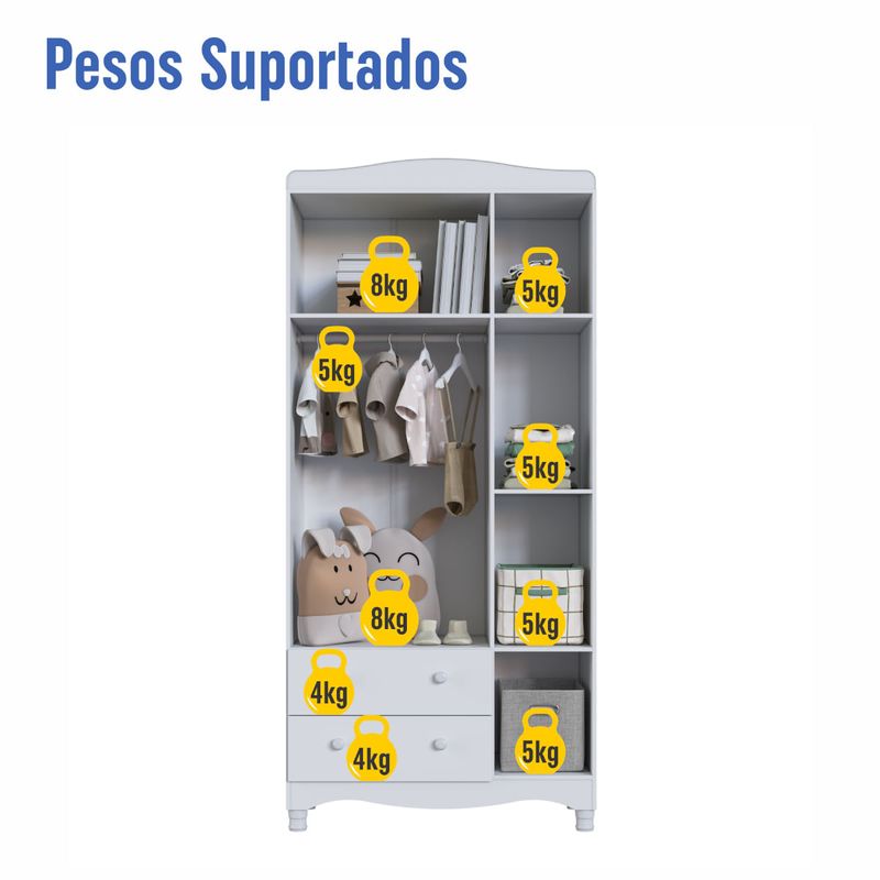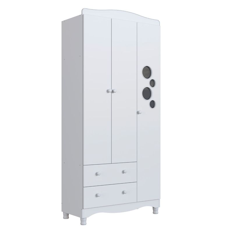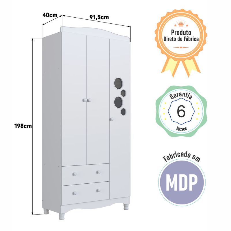 O Guarda-Roupas Infantil 3 Portas e 2 Gavetas Linha Encanto da Completa Móveis é a escolha ideal para trazer praticidade, organização e elegância ao quarto do bebê. Com design versátil, oferece amplo espaço interno distribuído em prateleiras, gavetas e nichos, facilitando a arrumação de roupas, acessórios e itens do dia a dia. Fabricado em MDP de qualidade, possui corrediças telescópicas que proporcionam maior suavidade na abertura das gavetas, puxadores em plástico resistentes e pés com regulagem de altura que garantem estabilidade e um diferencial no acabamento. Suas medidas são 91,5 cm de largura, 198 cm de altura e 40 cm de profundidade.
