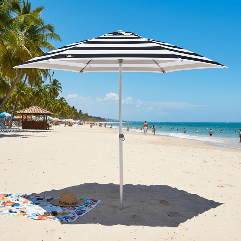 Guarda Sol Bel Milagres 2,40m: Proteção e Estilo para Seus Momentos de Lazer O Guarda-Sol Bel Milagres de 2,40 metros é a combinação perfeita de proteção solar, design moderno e praticidade. Com um charmoso padrão listrado em preto e branco, este guarda-sol eleva o estilo dos seus dias de praia, piscina, camping ou momentos relaxantes no jardim. Sua cobertura em poliéster com revestimento Silver Coating não apenas reflete os raios solares, proporcionando uma sombra agradável, mas também oferece proteção solar FPS 100, essencial para proteger sua pele dos efeitos nocivos do sol. A estrutura robusta, com varetas em fibra de vidro de 11mm, garante resistência a ventos moderados, enquanto a haste em alumínio de 32mm oferece leveza e durabilidade, ideal para uso em ambientes litorâneos. O sistema de ventilação integrado melhora a circulação do ar, evitando o superaquecimento sob o guarda-sol. Acompanha uma prática sacola tiracolo para facilitar o transporte e armazenamento, tornando-o o companheiro ideal para todas as suas aventuras ao ar livre. Especificações FPS: 100 Sacola para transporte: Sim Cobertura: Poliéster com revestimento Silver Coating Haste: Alumínio Ø 32 mm Armação: Alumínio Varetas: 6 unidades em fibra de vidro de 11 mm Cor: Preto e Branco Listrado Modelo: Milagres Dimensões montado (C x L x A): 2,40 m x 2,22 m Itens Inclusos 01 Guarda-Sol Bel Milagres 2,40 m Preto e Branco Listrado em Alumínio com Varetas de Fibra de Vidro 01 Sacola tiracolo para transporte Perguntas Frequentes (FAQ) Pergunta: Qual o nível de proteção solar deste guarda-sol?Resposta: O Guarda-Sol Bel Milagres oferece proteção solar FPS 100, bloqueando a grande maioria dos raios UV prejudiciais. Pergunta: O guarda-sol é resistente a ventos fortes?Resposta: As varetas em fibra de vidro de 11mm proporcionam boa resistência a ventos moderados. Pergunta: Este guarda-sol vem com sacola para transporte?Resposta: Sim, o produto acompanha uma sacola tiracolo para facilitar o transporte e armazenamento. Pergunta: Qual a garantia do produto?Resposta: Garantia legal: 90 dias