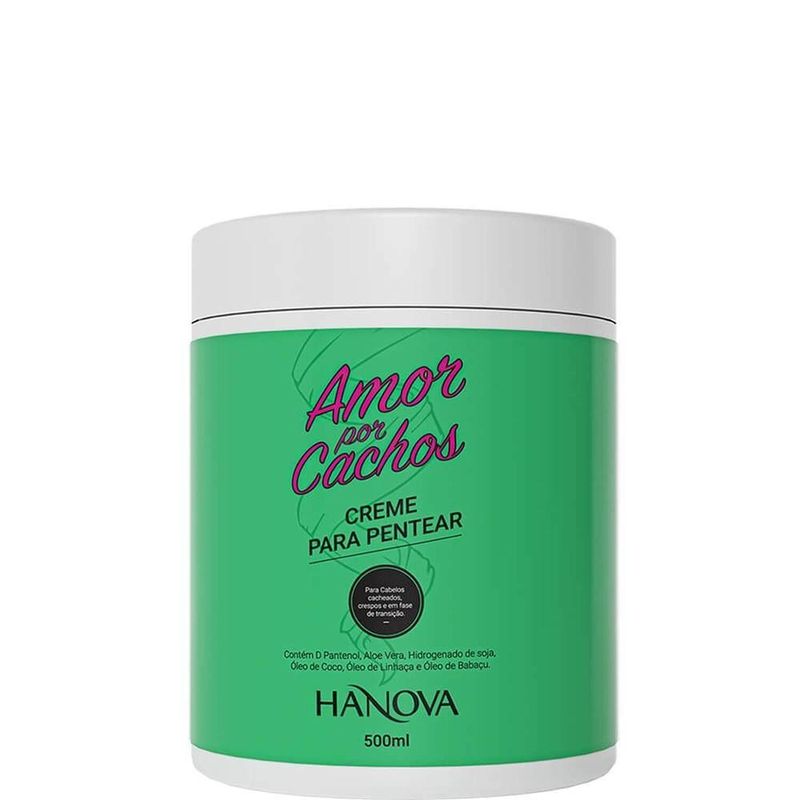Hanova Amor Por Cachos - Creme De Pentear Concentrado 500mlHanova Amor por Cachos - Creme de Pentear ConcentradoO Creme de Pentear Amor por Cachos Hanova hidrata, nutre e reconstrói os fios de maneira rápida e profunda. Ajuda na reposição da umidade, dos lipídeos e das proteínas, nos fios evitando o ressecamento, promovendo brilho, selando as ículas, fortalecendo a fibra evitando a quebra. Contém Óleo de Coco e Linhaça super mix de hidratação. Essa combinação perfeita vai deixar seus fios macios, brilhosos e fortes. Modo de UsoCom o cabelo limpo e úmido, aplique a quantidade que achar necessária do produto na palma da mão. Espalhe com leveza massageando bem os fios do meio até as pontas. Após proceda com a desejada (escova, prancha ou secagem natural).