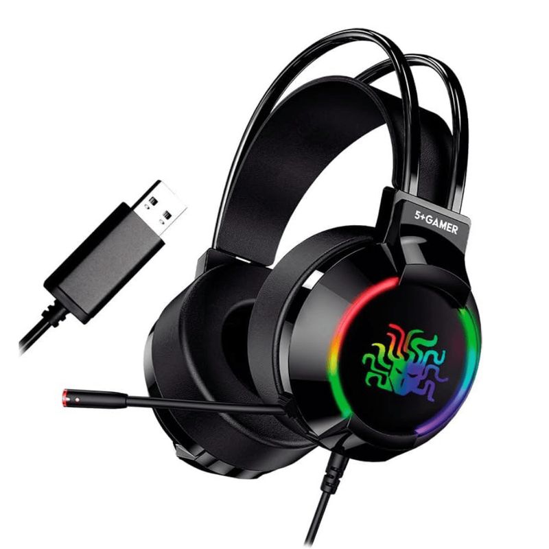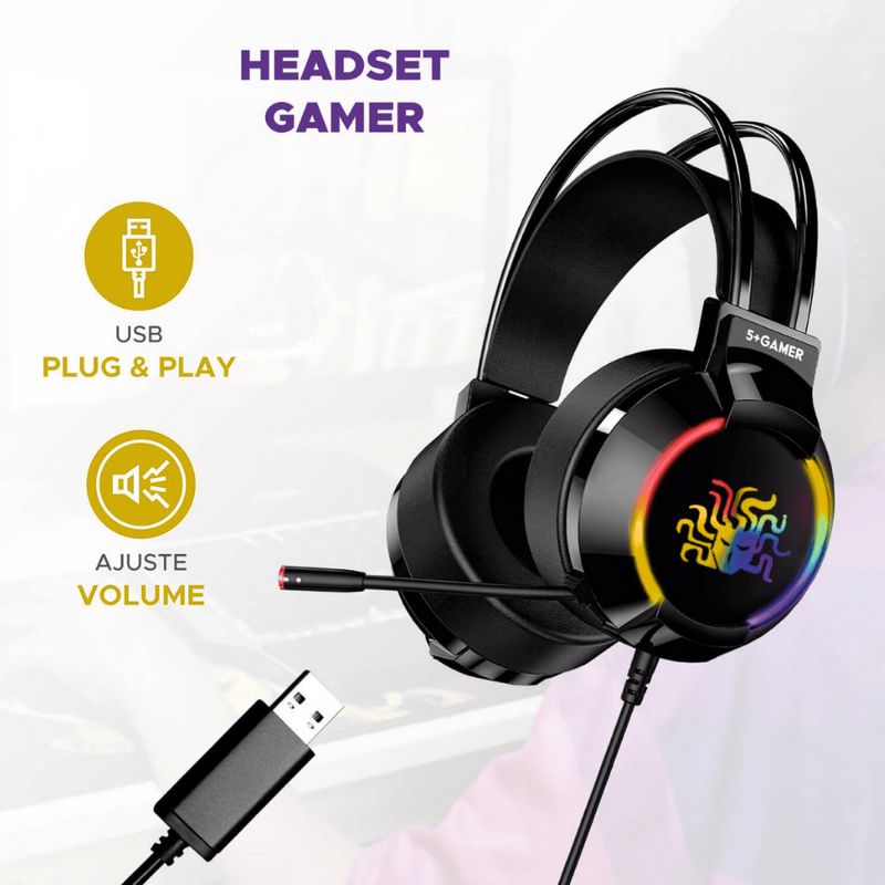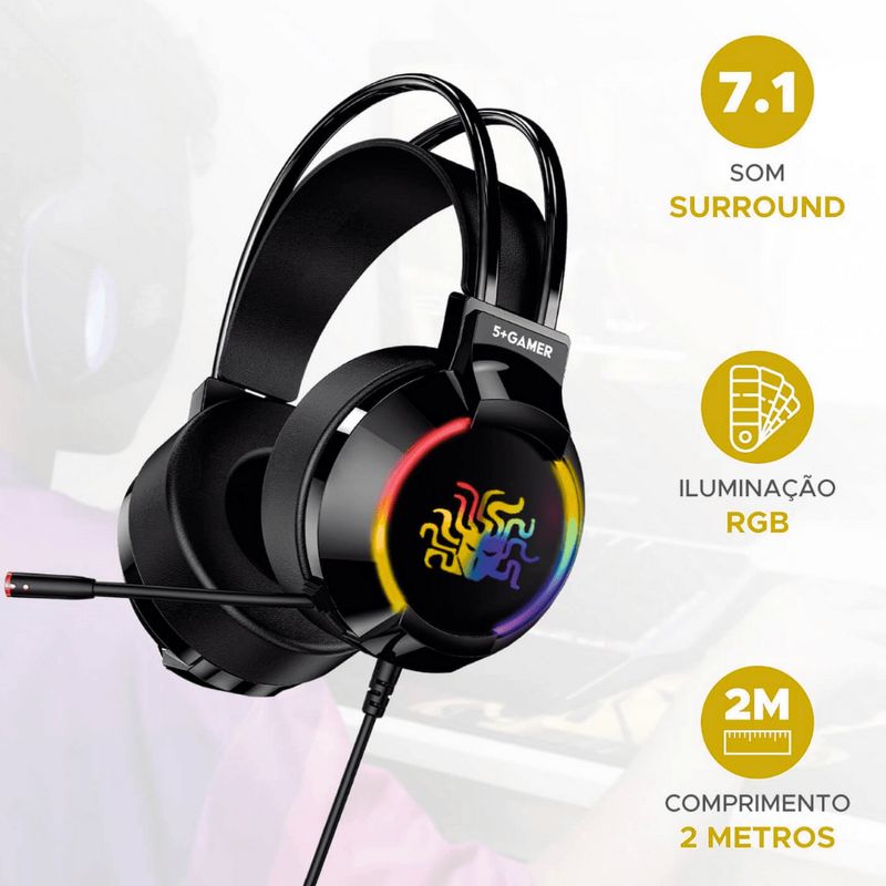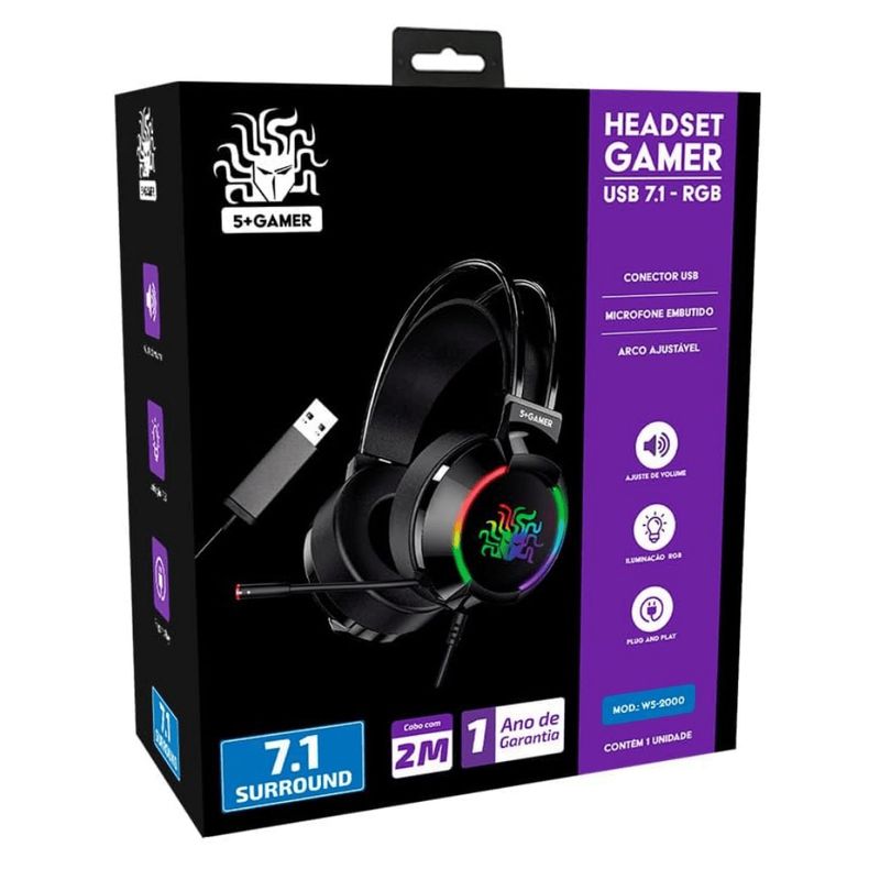 Headset Gamer RGB 5+ 7.1 USB Cabo 2 metros W5-2000 O Headset Gamer 5+ W5-2000 proporciona uma experiência sonora imersiva e de alta fidelidade para jogadores que buscam precisão. Com tecnologia de som surround virtual 7.1, ele permite a localização exata de cada efeito sonoro, enquanto sua iluminação RGB integrada oferece um visual moderno ao setup. O design ergonômico com arco ajustável e almofadas macias garante conforto extremo durante longas sessões de uso, aliado a um microfone flexível que assegura comunicação clara com a equipe. Características Som surround virtual de 7.1 canais Iluminação LED RGB nas laterais Drivers de neodímio com 50mm de diâmetro Microfone flexível com cancelamento de ruído Controle de volume integrado ao fone Almofadas de couro sintético ultra macias Arco de cabeça com ajuste de altura Sistema Plug and Play sem necessidade de drivers Informações adicionais Conexão USB 2.0 banhada a ouro Cabo de 2 metros com revestimento em nylon Frequência de resposta 20Hz a 20KHz Sensibilidade 110dB +/- 3dB Impedância 32 Ohms Sensibilidade do microfone -42dB +/- 3dB Compatibilidade com Windows, Linux e consoles com entrada USB de áudio
