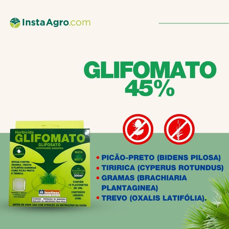 Herbicida Mata Mato Glifomato 45% Jardim Insetimax - 30ml Herbicida Não Seletivo Mata Mato O NOVO GLIFOMATO é um herbicida eficaz contra tiririca (Cyperus rotundus), picão-preto (Bidens pilosa) e gramas (Brachiaria plantaginea) e trevo (Oxalis latifólia). Modo de usar Diluir 3ml em 1 L de água. A quantidade de calda é o suficiente para tratar uma área de 30m². Contém 10 flaconetes de 3ml cada. Informações Técnicas Ingrediente Ativo: Glifosato Grupo Químico: Glicina Substituída Formulação: Líquido