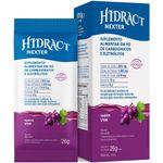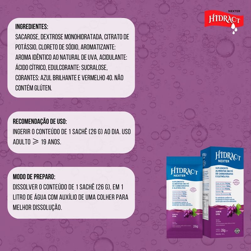 Hidract Nexter Suplemento Alimentar em Pó Sabor Uva 4 Unidades de 26g Energia, hidratação e recuperação em um só produto! O Hidract Nexter sabor uva é um suplemento alimentar em pó formulado com a combinação ideal de carboidratos e eletrólitos, como sódio e potássio, fundamentais para repor os nutrientes perdidos durante a prática de atividades físicas. Além de auxiliar na recuperação muscular, proporciona energia imediata com um sabor agradável e refrescante. Cada sachê de 26g contém carboidratos de rápida absorção e eletrólitos que ajudam a manter o equilíbrio hídrico do organismo. Sua fórmula inclui cloreto de sódio, citrato de potássio, citrato de sódio, sacarose e dextrose, promovendo hidratação eficiente e rápida reposição de energia. A embalagem conta com 4 sachês individuais, práticos e fáceis de levar para treinos, corridas, ciclismo e outras atividades esportivas. Benefícios Auxilia na recuperação da função muscular após exercícios intensos; Repõe sais minerais e carboidratos perdidos durante a atividade física; Fornece energia rápida e eficaz; Ajuda a manter o corpo hidratado e em equilíbrio; Sabor uva refrescante e agradável; Embalagem prática com 4 sachês de 26g cada. Modo de Uso Dissolver o conteúdo de 1 sachê (26g) em 500ml de água e consumir durante ou após a prática de atividade física, conforme orientação profissional. Precauções e Advertências Consumir conforme a recomendação de ingestão diária indicada na embalagem; Gestantes, lactantes e crianças devem consumir somente sob orientação médica ou nutricional; Manter fora do alcance de crianças; Conservar em local fresco, seco e protegido da luz solar.