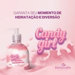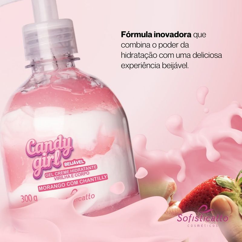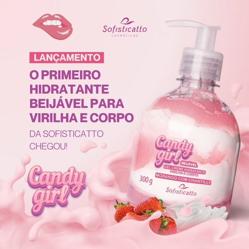 Candy Girl BEIJE, SINTA ESE APAIXONE Candy Girl é a combinação perfeitade hidratação e diversão ! Um cremehidratante beijável para o corpo e avirilha com sabor delicioso de morangocom chantilly, que transforma o cuidadocom a pele em uma experiência deliciosa Marca: SofisticattoEmbalagem: 1 - Hidratante Candy Girl Morango com Chantilly 300g