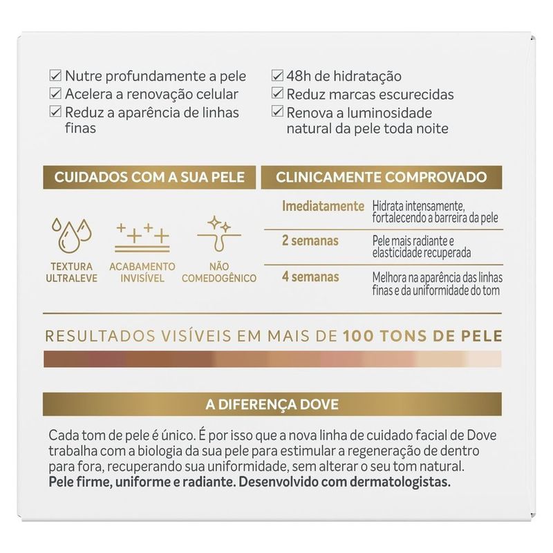 Hidratante Facial Noturno Dove Regenerative 50g Desperte com uma pele visivelmente mais renovada e radiante! O Hidratante Facial Noturno Dove Regenerative foi desenvolvido com a poderosa Tecnologia B3 Pro, que combina Niacinamida (Vitamina B3) e Pro-Retinol para promover a regeneração celular durante o sono. Este cuidado noturno oferece hidratação profunda e tratamento intensivo, contribuindo para uma pele mais firme, luminosa e com o tom uniforme desde as primeiras aplicações. O Hidratante Facial Noturno Dove Regenerative proporciona uma nutrição intensa, agindo enquanto você dorme para restaurar e fortalecer a barreira cutânea. Sua fórmula avançada estimula a produção de colágeno, melhorando a elasticidade da pele e suavizando linhas finas. Enriquecido com ácido hialurônico e vitaminas C, E e B6, ele garante uma hidratação duradoura e auxilia na renovação celular noturna. Benefícios Hidratação profunda e duradoura durante a noite Estimula a produção de colágeno, fortalecendo a pele Renova a luminosidade natural e uniformiza o tom da pele Reduz a aparência de linhas finas e sinais de cansaço Barreira cutânea até 4x mais forte com uso contínuo Modo de Uso Aplique o produto no rosto, pescoço e colo limpos antes de dormir. Espalhe com movimentos suaves e circulares até completa absorção. Para melhores resultados, utilize diariamente como parte da sua rotina de cuidados noturnos. Precauções e Advertências Uso externo. Não ingerir. Evite contato com os olhos. Em caso de contato, enxágue com água em abundância. Em caso de irritação, suspenda o uso e procure orientação médica. Mantenha fora do alcance de crianças. Armazene em local seco e fresco.