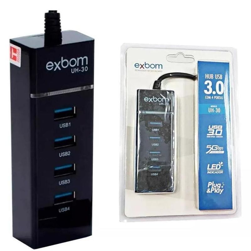 Hub USB 3.0 expansão 4 portas super speed 5.0Gb/s com LED indicadorHub USB 3.0 Exbom expansão das portas USB do seu notebook, ultrabook ou pc , com este dispositivo ultra rápido, confiável e funcional , ele dispõe de 4 portas USB 3.0, capaz de fornecer 900 mA de corrente elétrica (ao contrário da porta USB 2.0 comum, que só fornece 500mA), e dispensa fonte externa. Conecte até 4 dispositivos USB simultaneamente* (como hd externo, impressora, pendrive, mouse, teclado) em poucos segundos.Nota 1: O dispositivo só terá seu desempenho máximo se conectado a uma porta USB 3.0 (facilmente identificável pela sua cor azul). Ao conectar a uma porta usb 2.0 (preta), ele terá limitadas as velocidades de transferência e corrente elétrica disponível em cada porta. Nota 2: Ao contrário de muitos outros hubs a venda, este não requer fonte externa. Basta plugar e usar! Nota 3: O dispositivo não foi projetado para ser utilizado como carregador múltiplo de dispositivos. Ele depende da alimentação USB provinda de um computador/notebook. Não funcionará se ligado a uma fonte externa.Modelo: UH-30Interface de saída: 4 x USB 3.0 5.0Gb/sCor: pretoHot swap: simTipo de instalação: externoInterface de entrada: USB 3.0 (Recomenda)Compatível com a versão anterior: USB 2.0 USB 3.0 até 5.0 Gb/s de velocidade de transferênciaCompatível com os seguintes sistema operacional : windows® 2000, xp, vista, 7, 8, 8.1,10, mac e linux v.2.6x +, e versão mais recente.Medida do produto: 10.4 x 3.0 x 2.2cmConteúdo da embalagem: 1 un.Hub USB 3.0 expansão 4 portas super speed 5.0Gb/s UH-30 com LED indicador