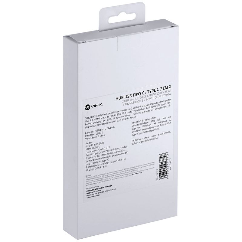 HUB USB TIPO C VINIK HC-72: Conectividade Essencial para Seus DispositivosO HUB USB Tipo C Vinik HC-72 é a solução ideal para expandir a conectividade de notebooks e dispositivos com porta USB-C. Projetado para atender às necessidades de usuários que buscam versatilidade e desempenho, este hub 7 em 2 transforma uma única porta USB-C em múltiplas opções de conexão, otimizando seu fluxo de trabalho e entretenimento.Este hub multifuncional permite conectar diversos periféricos simultaneamente, eliminando a necessidade de adaptadores múltiplos. Com ele, você pode transferir dados em alta velocidade, conectar monitores externos e carregar seu dispositivo, tudo através de uma única e compacta solução.Características e Benefícios ChaveExpansão 7 em 2: Conecta múltiplos dispositivos através de uma única porta USB-C.Portas USB 3.0: Duas portas USB 3.0 para conexão de periféricos como mouses, teclados e pendrives, com alta velocidade de transferência de dados.Leitor de Cartão SD e TF: Acesso rápido a fotos e vídeos de cartões SD e microSD, ideal para fotógrafos e criadores de conteúdo.Saída HDMI: Conecte seu dispositivo a um monitor externo, TV ou projetor com resolução de alta definição para apresentações ou entretenimento.Compatibilidade Thunderbolt 3: Suporte para tecnologia Thunderbolt 3, garantindo alta velocidade e desempenho.Power Delivery 100W: Carregue seu notebook ou dispositivo com até 100W de potência enquanto utiliza as outras portas do hub.Ficha TécnicaNome: HUB USB TIPO C TYPE C 7 EM 2 - 2 USB 3.0 + LEITOR DE CARTÃO SD TF + HDMI + THUNDERBOLT 3 + POWER DELIVERY 100W HC-72Marca: VINIKEAN: 7908020917748Código de Referencia: 34217