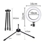 Iluminador Ring Light 16cm Usb Led Misto 3500k 5500k + TripeIluminador Ring Light de 16 centímetros (6,5 polegadas), desenvolvido para maquiadores, fotógrafos, cinegrafistas e etc, que buscam uma ótima maneira de iluminar com perfeição.Você pode ajustar o ângulo da iluminação por possuir um suporte articulado. É possível controlar as diferentes temperaturas de cores através do controle de ajuste que vai de 3200k à 5500k. Na frente dos leds tem um filtro difusor para suavizar a luz espalhando a luz com maior uniformidade.A alimentação do iluminador é através de cabo USB (não acompanha adaptador de tomada e não possui bateria interna recarregável), você pode utilizar um adaptador de tomada de celular para ligar ou conectar no USB do computador ou outro equipamento que forneça 5v USB. O cabo USB deverá estar sempre ligado para funcionar.O encaixe do Ring Light é através de encaixe padrão de tripés de rosca. O mini tripé também serve para utilizar em outros equipamentos de até 1kg de peso, como projetores, celulares e etc.É recomendado e extremamente eficaz para a macro fotografia, fotografia médica, odontológica, científica, hobby e para a iluminação/fotografia de produções de maquiadores.Fácil de usar, durável e de pouco peso, facilitando o transporte.Especificações:Diâmetro : 16 cmAlimentação: 5v USBComprimento aproximado do cabo: 1,90mTemperatura de cor: 3200k - 5500K ajustávelÂngulo Regulável: SimPotência: 10wItens Inclusos:01 - Iluminador circular01 - Mini ballhead01 - Mini tripé