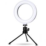 Iluminador Ring Light 6 Polegadas 16cm Usb Led Apoio Mesa .Iluminador Mini Ring Light Com Tripé Maquiagem 6 PolegadasO Iluminador de LED Ring Ligth portátil indicado para quem busca ampliar a iluminação de suas fotos e vídeos.Utilize a ring light de mesa para tirar selfies de alta fidelidade de cores e tons.Este iluminador amplia a iluminação do ambiente e é o item mais procurado e utilizado por profissionais e entusiastas dos mais diversos ramos e atividades, como esteticistas, fotógrafos, vídeo makers, youtubers.Utilize os ajustes de intensidade e tonalidade de cor para criar efeitos de iluminação e filtros práticos sem a necessidade de aplicativos ou editores de imagem.Leve e prático para o transporte, essa ring light é ideal para quem gosta de estar preparado em qualquer situação.O iluminador acompanha um controle multifunção e um tripé de mesa, sua iluminação é de LED e o tripé possui um suporte que rotaciona em 360 graus.INFORMAÇÕES TÉCNICAS:Intensidade de luz regulável.Sistema embutido regulador de cor: Fria, Média e Quente.Força total: 18W. Alimentação: USB 2A 5W/18W.Temperatura de cor: 3200k - 5500K ajustável Ângulo Regulável: Sim Potência: 10w Dimensões: 6 polegadas.Comprimento do cabo: 170cm.Comprimento do tripé: 13cm.Controle multifuncional acoplado.Incluso tripé rotacional.Cor do Tripé: PretoDiâmetro : 16 cmAlimentação: 5v USBComprimento aproximado do cabo: 1,90mItens Inclusos: 01 -Iluminador Circular 01- Mini Ballhead 01- Mini Tripé Rotacional