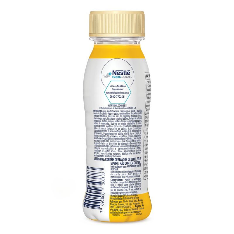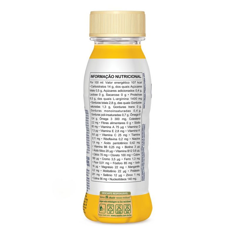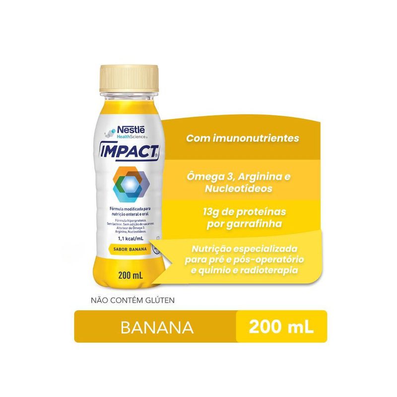 Nutrição Enteral e Oral Impact Banana 200ml Experimente a nutrição prática e saborosa do Impact Banana 200ml. Esta bebida nutricional é formulada para fornecer um suporte equilibrado de nutrientes, ideal para quem busca uma alimentação saudável e conveniente. Com um delicioso sabor de banana, o Impact é perfeito para ser consumido a qualquer hora do dia, seja como um complemento nutricional, um lanche rápido ou uma refeição leve. A embalagem prática de 200ml é fácil de levar para onde você for, garantindo que você tenha nutrição e sabor ao seu alcance sempre que precisar. Para que serve o Nutrição Enteral e Oral Impact Banana 200ml? Nutrição Enteral e Oral Impact Banana 200ml é uma solução nutricional completa e balanceada, indicada para pacientes que necessitam de suporte alimentar, seja por via enteral ou oral. Com sabor de banana, esse produto é ideal para quem precisa de uma nutrição suplementar para recuperação pós-cirúrgica, tratamento de condições que afetam a ingestão alimentar ou para ganho de peso. Enriquecido com proteínas de alta qualidade, carboidratos, vitaminas e minerais, ajuda a fortalecer o sistema imunológico, promover a recuperação nutricional e fornecer energia ao corpo. Como usar o Nutrição Enteral e Oral Impact Banana 200ml? AGITAR BEM ANTES DE USAR. Fórmula comercialmente estéril. Manusear de acordo com asBoas Práticas de Manipulação para evitar contaminação. Consuma o produto diretamente ou conforme orientação do médico ou nutricionista. Para uso enteral, siga as instruções recomendadas pelo profissional de saúde. Pode ser ingerido de forma gradual para maior conforto digestivo, sempre respeitando a quantidade indicada para o paciente. Modo de Preparo AGITAR BEM ANTES DE USAR. Fórmula comercialmente estéril. Manusear de acordo com as boas práticas de manipulação para evitar contaminação. Ingredientes Água, maltodextrina, caseinato de sódio, L-arginina, caseinato de cálcio, óleo de peixe, triglicerídeos de cadeia média, minerais (citrato de potássio, sais de magnésio do ácidocítrico, cloreto de potássio, fosfato de cálcio tribásico, fosfato de potássio monobásico, sulfato ferroso, sulfato de zinco, gluconato de cobre, sulfato de manganês, fluoreto de sódio, molibdato de sódio, selenito de sódio, iodeto de potássio e cloreto de cromo), óleo de milho, vitaminas (bitartarato de colina, ácido L-ascórbico, L-ascorbato de sódio, DL-alfa tocoferol, acetato de DL-alfa-tocoferila, nicotinamida, D-pantotenato de cálcio, cloridrato de cloreto de tiamina, cloridrato de piridoxina, acetato de retinila, riboflavina, ácido N-pteroil L-glutâmico, fitomenadiona, D-biotina, colecalciferol e cianocobalamina), nucleotídeos (sal dissódico de uridina 5-monofosfato, sal dissódico de guanosina 5-monofosfato, citidina 5-monofosfato e adenosina 5-monofosfato), estabilizantes celulose microcristalina e carboximetilcelulose sódica, regulador de acidez ácido cítrico, emulsificante lecitina de soja, aromatizantes naturais, edulcorante sucralose e antiespumante polidimetilsiloxano. Modo de Conservação Manter a embalagem fechada à temperatura ambiente em local seco e fresco. Após aberta, conservar devidamente tampada e sob refrigeração por no máximo 24h. A viscosidade do produto é maior quando refrigerado. Advertências Uso sob orientação de um profissional de saúde. Não deve ser utilizado como única fonte de alimentação, a menos que indicado por um médico. Conservar em local fresco e seco, protegido da luz. Após aberto, consumir dentro de 24 horas. Manter fora do alcance de crianças. ALÉRGICOS: CONTÉM DERIVADOS DE LEITE, SOJA E PEIXE. Principais Benefícios Fórmula rica em proteínas de alto valor biológico para manutenção e recuperação muscular Enriquecido com vitaminas e minerais essenciais para uma nutrição completa Sabor de banana, facilitando o consumo e tornando-o mais agradável Ideal para pacientes com dificuldades de ingestão alimentar ou necessidades nutricionais específicas Suporte nutricional prático e de fácil ingestão NÃO CONTÉM GLÚTEN. Dica Para um consumo mais refrescante e agradável, sirva o Nutrição Enteral e Oral Impact Banana gelado. Essa dica pode proporcionar mais prazer ao consumir a solução nutricional, especialmente em dias quentes! Informação Nutricional Quantidadepor 100mL % VD* Valor Energético 109 kcal = 458 kJ ** Carboidratos, dos quais: 14 g ** Açúcares 0,7 g ** Lactose 0 g ** Sacarose 0 g Proteínas 6,5 g ** Gorduras totais 2,8 g ** Gorduras saturadas 1,3 g ** Gorduras trans 0 g ** Fibra Alimentar 0 g ** Sódio 130 mg 5% Cálcio 37 mg 4% Ferro 1,1 mg 8% Potássio 75 mg ** Cloreto 156 mg ** Fósforo 60 mg 9% Magnésio 18 mg 7% Zinco 1,0 mg 14% Manganês 0,11 mg 5% Cobre 110 µg 12% Molibdênio 22 µg 49% Iodo 15 µg 12% Cromo 4,0 µg 11% Selênio 13 µg 37% Vitamina A 115 µg RE 19% Vitamina D 0,46 µg 9% Vitamina E 2,7 mg α TE 27% Vitamina C 50 mg 111% Niacina 1,4 mg 9% Ácido Pantotênico 1,2 mg 24% Vitamina B6 0,18 mg 13% Riboflavina (Vit. B2) 0,17 mg 13% Tiamina (Vit. B1) 0,11 mg 9% Biotina 6,4 µg 21% Ácido Fólico 25 µg 10% Vitamina K 9,5 µg 15% Vitamina B12 0,60 µg 25% Colina 24 mg 4% * % Valores diários de referência com base em uma dieta de 2.000 kcal ou 8.400 kJ.Seus valores diários podem ser maiores ou menores dependendo de suas necessidades energéticas.**VD não estabelecido. Perguntas Frequentes 1. Para quem o Impacto Nestlé é indicado? É indicado para pacientes que se submetem a cirurgias de grande porte, como as oncológicas, necessitando de suporte nutricional e imunológico para recuperação. 2. O que faz o Impacto Nestlé ser tão eficaz? Sua fórmula rica em proteínas, arginina e nucleotídeos ajuda a fortalecer o sistema imunológico e acelerar a recuperação pós-cirúrgica. 3. Quais sabores estão disponíveis? O Impact Nestlé está disponível nos sabores torta de limão, pêssego, bana