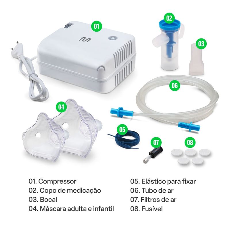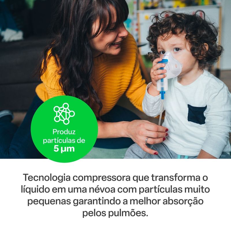 Eficiência para o momento da inalação e no tratamento de doenças respiratórias.Baixa emissão de ruídos: = 63dB.Tecnologia compressora que produz partículas de 5 µm.Aceitação universal de soros e medicamentos.Bivolt chaveado com fusível externo.Tempo de funcionamento: 30 minutos de uso e 30 minutos de descanso.Indicado para: adultos e crianças.Acompanha: 2 máscaras (adulto e infantil), 1 elástico para fixação, 5 filtros, 1 copo para medicamento e 1 tubo conector e 1 fusível.Perguntas frequentesQual a diferença entre inalador e inalador compressor?Ambos os inaladores auxiliam no tratamento de doenças respiratórias. Porém, funcionam de maneiras diferentes: Inalador comum: possui uma estrutura simples e geralmente é pequeno, cabendo na palma da mão, como a bombinha de asma. Para liberar a medicação, basta pressionar o cartucho. Inalador compressor: é um aparelho eletrônico composto por um compressor, máscara e fonte de energia. Utiliza um compressor elétrico para gerar um fluxo de ar que dispersa o medicamento.Para que serve um inalador compressor?Um inalador compressor serve para administrar medicamentos de forma mais eficiente no tratamento de doenças respiratórias. Com a tecnologia compressora, ele reduz as partículas do soro ou medicamento, contribuindo para melhor absorção do líquido pelos pulmões.Qual o melhor inalador nebulizador ou compressor?Indicamos o Inalador Compressor AirPlus Multi Saúde como uma excelente opção para o tratamento de doenças respiratórias. Ele é conhecido por sua eficiência e confiabilidade. Além disso, garante uma nebulização eficaz, aceita soros e medicamentos, tem baixo ruído e é bivolt.Imagens meramente ilustrativas.