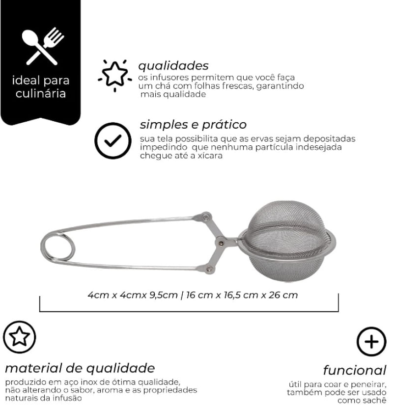 Infusor de Inox com Cabo para Chá - Mimo StylePerfeição e praticidade no preparo do seu chá O Infusor de Inox com Cabo para Chá da Mimo Style é o utensílio ideal para os amantes de chá que buscam facilidade no preparo da bebida. Seu design compacto e inteligente permite uma infusão perfeita, garantindo que as folhas de chá se expandam livremente, liberando todo o seu sabor e aroma. Diferenciais:Fabricado em aço inox, proporcionando durabilidade e resistência.Formato de bola que permite a expansão das folhas de chá.Fácil de usar e limpar, ideal para o dia a dia. Mais sobre o Produto:Basta abrir o infusor, adicionar a porção de chá desejada e mergulhar na caneca com água quente. Deixe em infusão pelo tempo necessário e desfrute de um chá saboroso e aromático. Dicas de Uso:Ideal para preparar chás a granel ou em saquinhos.Pode ser utilizado com diferentes tipos de chá, como chá verde, chá preto, chá de frutas, entre outros.Após o uso, basta realizar a lavagem a mão para manter a peça em perfeitas condições. Ficha Técnica:Marca: Mimo StyleMaterial: InoxCor: PrateadoDimensões: Altura 5cm x Largura 5cm x Comprimento 17cmPeso: 40gModo de Lavagem: Apenas lavagem a mãoAdquira agora o Infusor de Inox com Cabo para Chá da Mimo Style e transforme a sua experiência de preparo de chá em um momento prático e cheio de sabores!