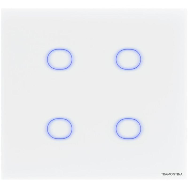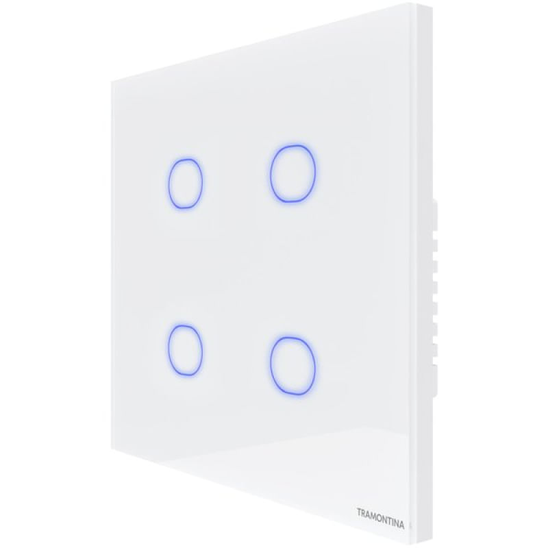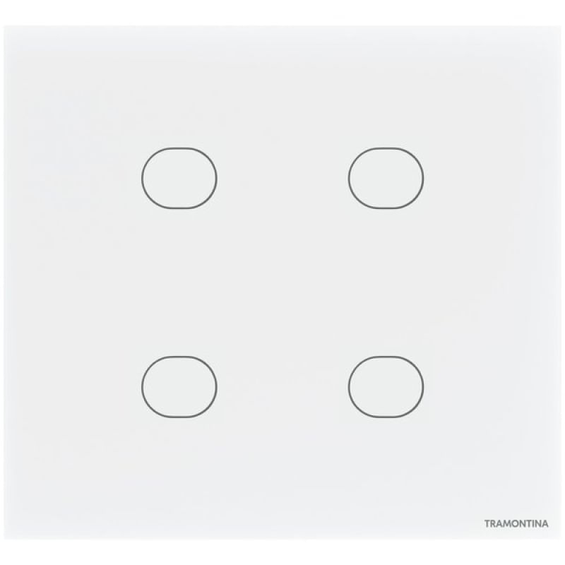Interruptor Touch Smart 4x4 Tramontina Branco 4 Canais Tramontina - Para uma casa inteligente e conectada, escolha o interruptor touch smart 4x4 Tramontina branco com 4 canaisProjetado para controlar a iluminação de forma fácil e prática, ele permite efetuar comandos por voz, via Alexa e Google Assistente. Ele permite criar cenas e rotinas inteligentes que podem ser acionadas por sua geolocalização, conforme a previsão do tempo ou mesmo fazer o agendamento para que as luzes liguem ao acordar, deixando a iluminação mais agradável.Seu design é moderno, com painel de vidro na cor branca e botão Touch retro iluminado com LEDs azuis, que proporcionam comandos com toque suave. O interruptor é bivolt e precisa de fio neutro para a instalação, assim como rede Wi-Fi de 2.4 giga hertz. Ele ainda possui bluetooth para auxiliar na configuração no aplicativo e aceita comunicação por rádio frequência 433 mega hertz, permitindo que você acione a iluminação através de controles remotos.Adquira os interruptores Smart Tramontina e tenha uma casa funcional e sempre conectada! Características Gerais do Produto: Garantia: • 2 Anos