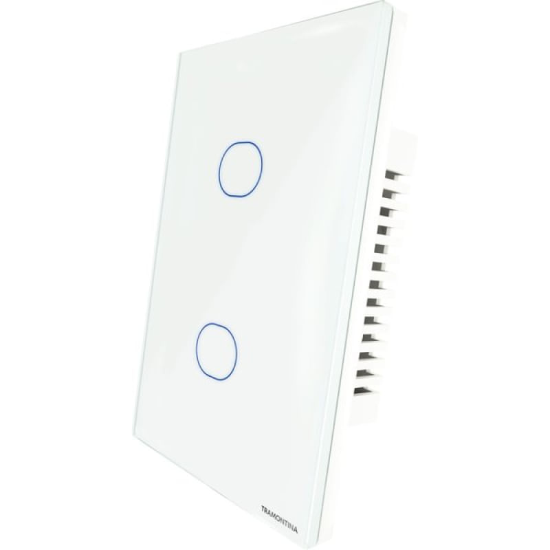 Interruptor Touch Smart Tramontina Branco 2 Canais Tramontina - Adquira já o interruptor touch smart Tramontina branco com 2 canais e tenha acesso a uma iluminação inteligente e conectada. Com essa tecnologia, você pode controlar a iluminação da sua casa de onde você estiver, por comandos de voz via Alexa e Google Assistente ou através do aplicativo exclusivo Tramontina smart. É possível programar a iluminação de acordo com a sua localização, previsão do tempo e agendar de horários, proporcionando ainda mais conforto e praticidade para o seu dia a dia, além de criar diversos cenários para seus ambientes. Com um design sofisticado, ele possui um painel em vidro disponível na cor branca com botão touch retro iluminado com LEDs azuis, que também possibilitam comandos com toque suave, com duas opções de controle. É importante destacar que ele é bivolt, tem corrente máxima de 10 amperes e necessita de fio neutro para a instalação e rede Wi-Fi de 2.4 giga hertz. Também possui bluetooth para auxiliar na configuração no aplicativo e aceita comunicação por rádio frequência 433 mega hertz, para acionar com controles remotos, por exemplo. Não perca mais tempo e garanta já o seu para ter uma iluminação inteligente e conectada na sua casa! Características Gerais do Produto: Garantia: • 2 anos (90 dias de garantia legal acrescido de 1 ano e 9 meses de garantia contratual).
