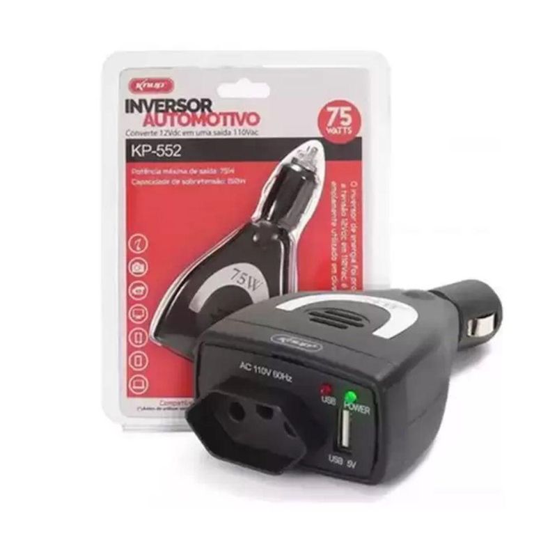 Inversor Automotivo Portátil 12v Para 110v Com 75wInversor Automotivo Portátil 12V Para 110V Com 75WBasta ligar este inversor na tomada 12V do carro e você poderá carregaros seus dispositivos diretamente da bateria do seu carro. A potêncianominal de saída é de 75W, podendo ser amplamente utilizada em todosos tipos de equipamentos elétricos com consumo interior a 75W, tais comonotebook, celular, câmera digital, vídeo digital, DVD, carregadores ediversos tipos de ferramentas. Ideal para emergências, viagens, veículos,uma solução simples para ampliar o uso da eletricidade no automóvel.Especificações:Marca: KnupModelo: KP-552Potência: 75WEntrada: 12VSaída: 110VUSB: 5VFrequência: 60 HzFácil de UsarBaixo consumo de energia da bateriaProteção contra sobrecarga e curto-circuitoEntrada USB: Para equipamentos elétricos pequenos que utilizam energia 5V