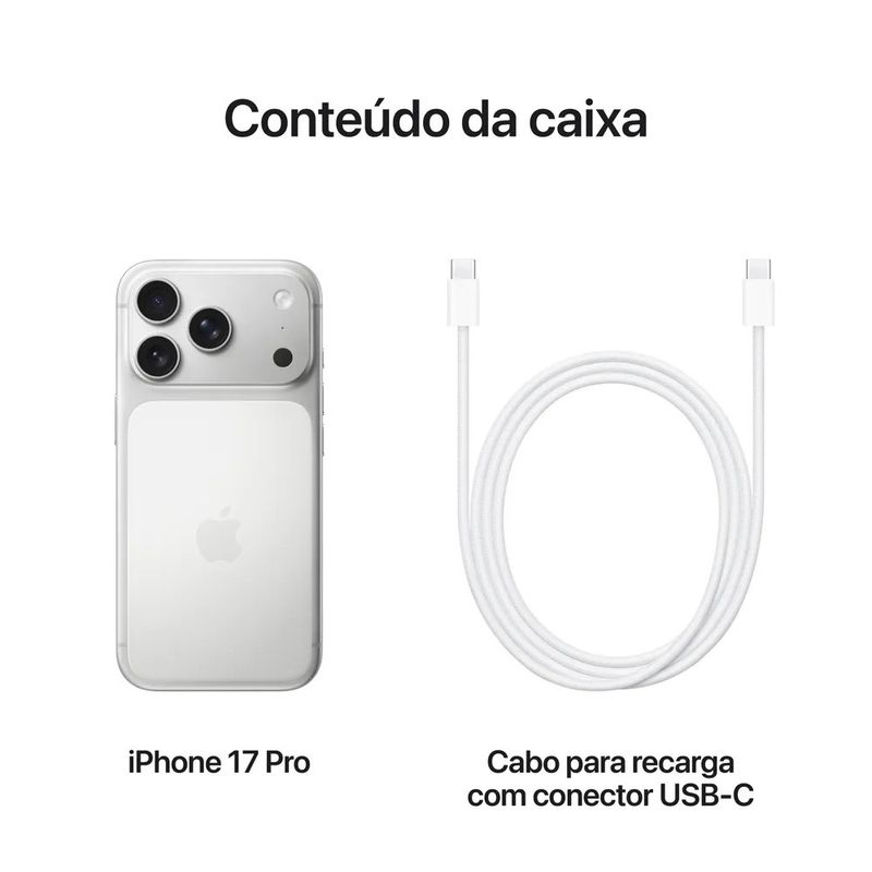 iPhone 17 Pro Apple (1TB) Prateado: Tela Super Retina 6,3", 5G e Câmera de 48MPO iPhone 17 Pro de 1TB na cor Prateado une sofisticação e desempenho de última geração, oferecendo uma experiência completa para quem exige potência e amplo espaço de armazenamento. Sua tela Super Retina XDR OLED de 6,3 polegadas proporciona brilho intenso, contraste profundo e cores vibrantes, garantindo imersão total em vídeos, fotos e jogos.Potência e Desempenho AvançadoCom o chip A19 Pro e o iOS 26, o iPhone 17 Pro entrega velocidade impressionante, fluidez em multitarefas e alto desempenho em jogos e aplicativos exigentes, sempre com excelente eficiência energética.Capture Momentos com Qualidade ProfissionalA câmera traseira de 48MP com gravação em 4K Dolby Vision garante fotos ultradetalhadas e vídeos cinematográficos. Já a câmera frontal de 18MP assegura selfies nítidas e chamadas de vídeo em alta definição, tornando cada registro ainda mais especial.Conectividade Moderna e RápidaCom suporte a 5G, Wi-Fi de última geração e Bluetooth atualizado, o iPhone 17 Pro oferece conexão estável e veloz em qualquer lugar. Além disso, a tecnologia Dual SIM (nano SIM + eSIM) amplia as opções de uso e praticidade.Mais Espaço, Mais LiberdadeCom 1TB de armazenamento interno, você tem espaço de sobra para aplicativos, fotos, vídeos e documentos, sem se preocupar com falta de memória.Resistência e DurabilidadeCom acabamento prateado sofisticado, estrutura reforçada e resistência contra água e riscos, o iPhone 17 Pro combina estilo e robustez para o dia a dia.Bateria de Longa DuraçãoA bateria oferece até 31 horas de uso contínuo, com suporte a carregamento rápido e recarga sem fio via MagSafe, Qi2 e Qi7.Especificações TécnicasSistema Operacional: iOS 26Tela: 6,3" Super Retina XDR OLEDProcessador: Apple A19 ProArmazenamento: 1TBCâmera Traseira: 48MP (foto), 4K Dolby Vision (vídeo)Câmera Frontal: 18MPConectividade: 5G, Wi-Fi, Bluetooth, Dual SIM (nano SIM + eSIM)Bateria: até 31 horas de uso, recarga via USB-C e sem fio (MagSafe, Qi2, Qi7)Cor: PrateadoGarantia: 12 mesesItens Inclusos1 iPhone 17 Pro (1TB) Prateado1 Cabo USB-C (1m)Documentação¹ A duração da bateria pode variar conforme o uso e as configurações do dispositivo.