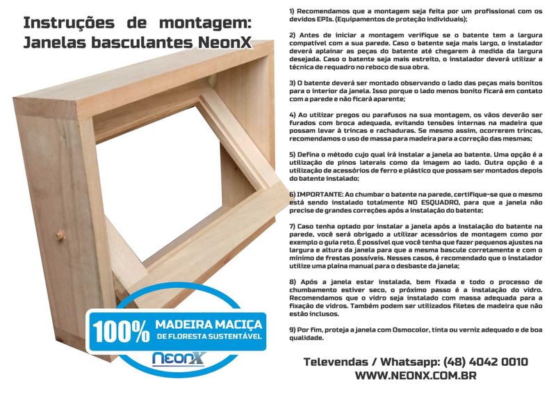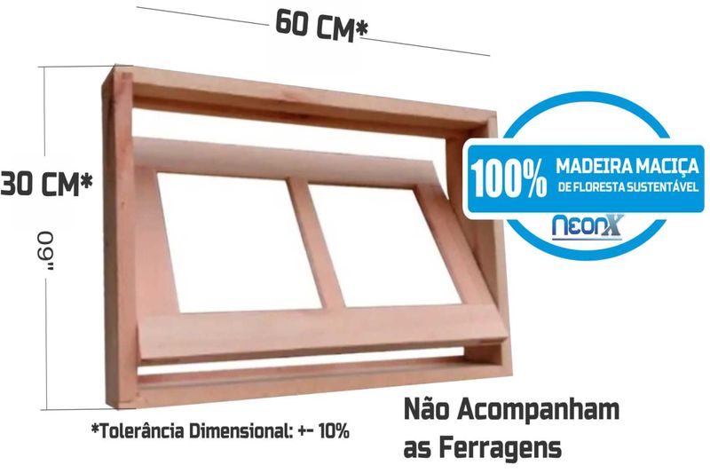 Aqui você encontra uma linha de janelas basculantes para seu banheiro ou outros ambientes. Perfeita para trazer mais charme e funcionalidade ao seu banheiro. Fabricada com madeira maciça de eucalipto, essa janela de alta qualidade possui um design elegante e moderno, ideal para diversos estilos de decoração. Com as medidas de 40x60 cm, é uma excelente escolha para quem busca praticidade e beleza em um único produto. Trata-se de um produto de alta qualidade e segurança para a sua casa! Especificações: - Largura útil: 60 cm; - Altura útil: 30 cm; - Profundidade do batente (Poderá ser reduzida pelo pedreiro ou instalador no momento da instalação): 14 cm; - Acabamento: Madeira lixada e sem pintura; - Fabricada em madeira maciça; - Espessura da madeira: 3 cm; - Tipo de madeira: Eucalipto de florestas renováveis; - Vão para dois vidros (vidro não incluso); - Não acompanham as ferragens e o vidro; - Produto segue desmontado; - Rebaixo de 1 cm (Recomenda-se vidro de no máximo 0,5 cm de espessura); - Não acompanham filetes para fixação do vidro. Recomenda-se a fixação do vidro com massa para esse fim; - Não acompanham as vistas; - Recomendamos a instalação por profissional capacitado: - Tolerância dimensional: 5% para mais ou para menos. Sobre a Marca: A NeonX ® é uma marca registrada. Possui quase 50 anos de mercado e é a maior fabricante de decks modulares em madeira do Brasil. Conta com rígido controle de qualidade e padronização de seus produtos. Pode confiar na NeonX ®. Observações: - O produto segue desmontado; - O produto pode ser ajustado em alguns cm no momento da instalação pelo instalador / marceneiro / pedreiro; - Não possui orifício para fechadura, devendo ser feito pelo instalador; - Por não possuir orifício para fechadura, poderá ser instalada como direita ou esquerda, em retrato ou paisagem; Verifique com o instalador. - Não nos responsabilizamos pela montagem do produto. - Não acompanham acessórios como ferragens, vidro, massa para vidro nem fixadores.