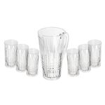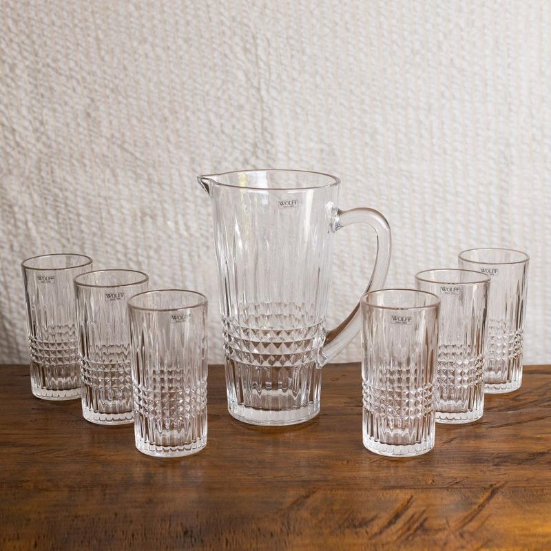Jarra com 6 Copos Wolff Queen de Vidro 1,5L/320mlO Conjunto Jarra com 6 Copos de Vidro Queen da Wolff é uma combinação elegante e funcional que eleva a experiência de servir suas bebidas favoritas com sofisticação e estilo.Design HarmoniosoCom linhas suaves e um design atemporal, a jarra e os copos Queen destacam-se pela sua elegância discreta, adicionando um toque de requinte à sua mesa.Material de QualidadeFabricados com vidro de alta qualidade, tanto a jarra quanto os copos são duráveis e resistentes, proporcionando uma experiência de uso segura e confiável.Capacidade IdealCom capacidade para 1,2 litros, a jarra é perfeita para servir uma variedade de bebidas, desde sucos naturais até água e coquetéis, enquanto os copos de 320ml são ideais para porções individuais.Versatilidade de UsoEste conjunto é adequado para diversas ocasiões, desde refeições em família até encontros sociais e festas, sendo uma escolha versátil e prática para servir suas bebidas favoritas.Seja para uso diário ou para ocasiões especiais, o Conjunto Jarra com 6 Copos de Vidro Queen da Wolff é uma adição elegante e funcional para a sua coleção de utensílios de mesa.Wolff. A melhor experiência em receber, servir e decorar!Contém: 1 Jarra 1,2L6 Copos 320mlLava Louça: NãoMicroondas: NãoForno: NãoFogão: NãoFreezer: NãoMedidas Produto: Altura 23,00cm x Largura 13,00cm x Comprimento 18,50cmPeso: 1,32KgCor: IncolorMaterial: VidroLavar com detergente neutro, esponja macia e secar imediatamente.