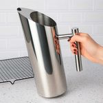 Jarra de suco e agua em aço inox. A jarra possui bico inclinado com aparador de gelo facilitando na hora de servir. O recipiente foi produzido em aço inox, resistente a impactos, possui maior resistencia a trincas e rupturas, mesmo em contato com altas e baixas temperaturas. Resistente a oxidaçao, nao vai descolorir ou manchar com o tempo. A jarra alem de um designer sofisticado é confortavel de segurar, sendo perfeita para servir em bares, restaurantes, festas e buffet. Contem: 1 Jarra Capacidade: 1L Medidas: 23,5 x 14 cm Material: Aço inoxidavel Peso: 450g
