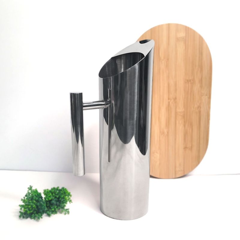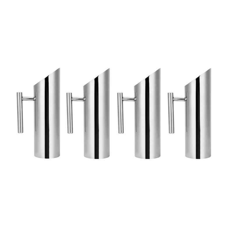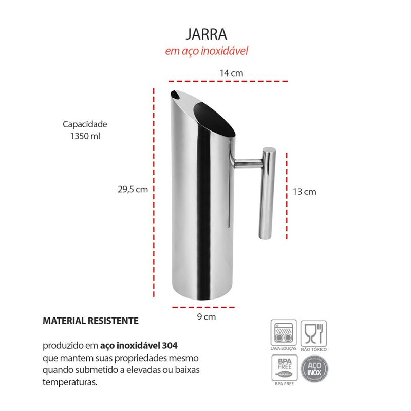 Jarra de suco e agua em aço inox. A jarra possui bico inclinado com aparador de gelo facilitando na hora de servir. O recipiente foi produzido em aço inox 304, resistente a impactos, possui maior resistencia a trincas e rupturas, mesmo em contato com altas e baixas temperaturas. Resistente a oxidaçao, nao vai descolorir ou manchar com o tempo. A jarra alem de um designer sofisticado é confortavel de segurar, sendo perfeita para servir em bares, restaurantes, festas e buffet. 4 Jarras Capacidade: 1350 ml Medidas: 29,5 x 14 cm Material: Aço inoxidavel 304 Peso: 480g