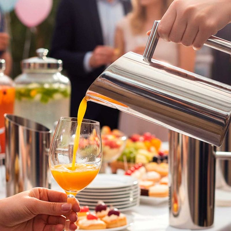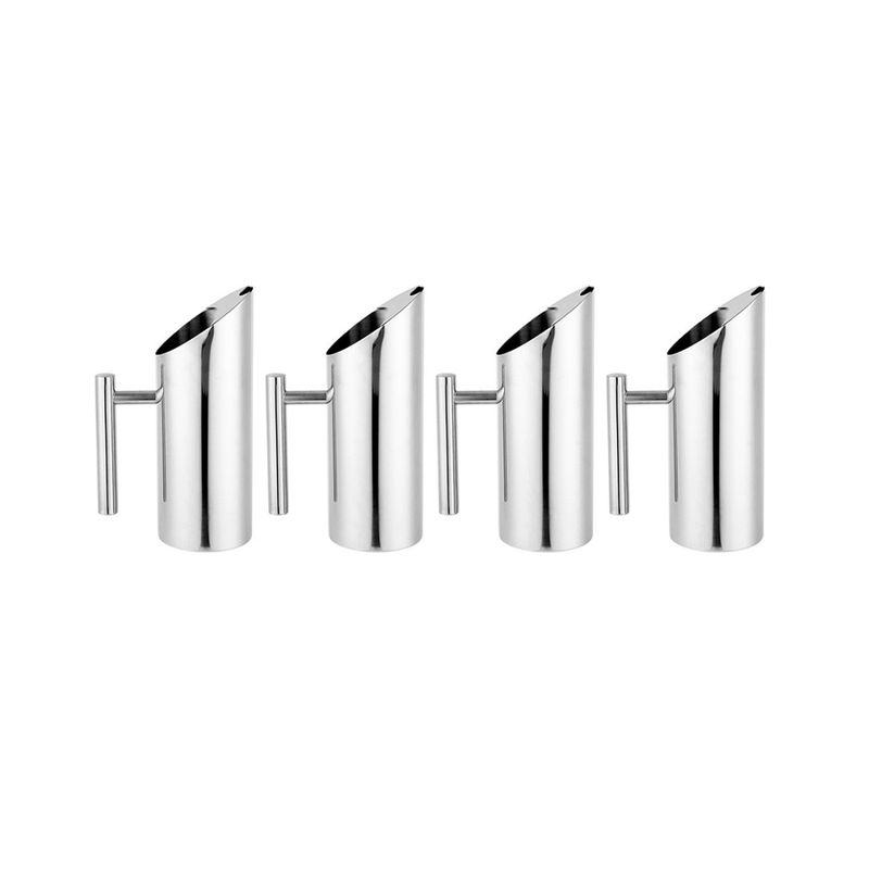 Jarra de suco e agua em aço inox. A jarra possui bico inclinado com aparador de gelo facilitando na hora de servir. O recipiente foi produzido em aço inox, resistente a impactos, possui maior resistencia a trincas e rupturas, mesmo em contato com altas e baixas temperaturas. Resistente a oxidaçao, nao vai descolorir ou manchar com o tempo. A jarra alem de um designer sofisticado é confortavel de segurar, sendo perfeita para servir em bares, restaurantes, festas e buffet. Contem: 4 Jarras Capacidade: 1L Medidas: 23,5 x 14 cm Material: Aço inoxidavel Peso: 450g