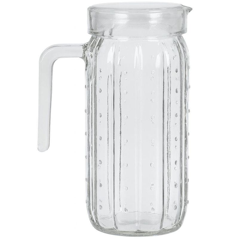 Seja bem-vindo(a) a Loja NIVALMIX,Esta jarra de vidro com tampa é a combinação perfeita de praticidade e elegância para o seu dia a dia. Com design moderno e diferenciado, possui acabamento em relevo com bolinhas em estilo poá e linhas verticais que dão um charme especial à peça. Além de funcional, é resistente e fácil de manusear, contando com alça ergonômica que garante firmeza e segurança ao servir. Ideal para sucos, águas saborizadas, chás gelados e outras bebidas, esta jarra é perfeita tanto para momentos em família quanto para receber convidados, trazendo beleza e sofisticação à sua mesa.Especificações• Marca: Quanhe • Referência: N249054-6• Cor: Incolor• Material: Vidro• Capacidade: 1L• Dimensões: 7,5x23cm • Garantia do fabricante: 3 meses • Validade IndeterminadaItens Inclusos• 01 Jarra de vidro com tampa