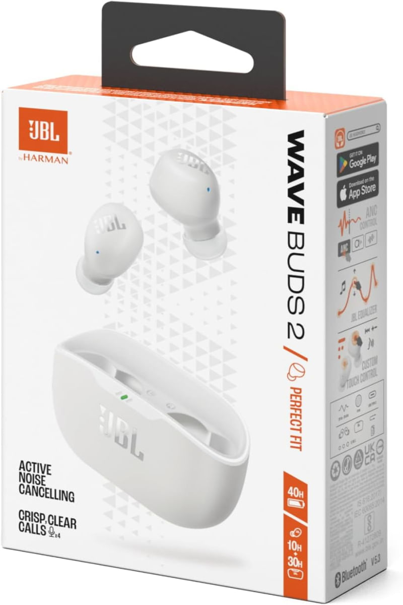 Sobre este itemSOM JBL PURE BASS IMPACTANTE. Curta graves profundos e empolgantes com drivers dinâmicos de 8 mm que entregam a energia do som JBL Pure Bass, elevando sua experiência sonora.TECNOLOGIAS AVANÇADAS. O cancelamento de ruído ativo bloqueia o som externo, enquanto o Smart Ambient permite ajustar a quantidade de som do ambiente que você quer ouvir.CHAMADAS CRISTALINAS. Com 2 microfones em cada fone, as chamadas ficam claras e sem interferências, até em ambientes movimentados e ventosos suas chamadas serão perfeitas.RESISTENTES À ÁGUA E POEIRA. Enfrente as condições de clima instáveis com confiança, já que os fones de ouvido JBL Wave Buds 2 são resistentes à água e poeira, graças a certificação IP54.BATERIA GIGANTE. Aproveite até 40 horas de reprodução (com cancelamento de ruído desligado), e recarregue rapidamente com apenas 10 minutos de carga para 3 horas adicionais de uso.
