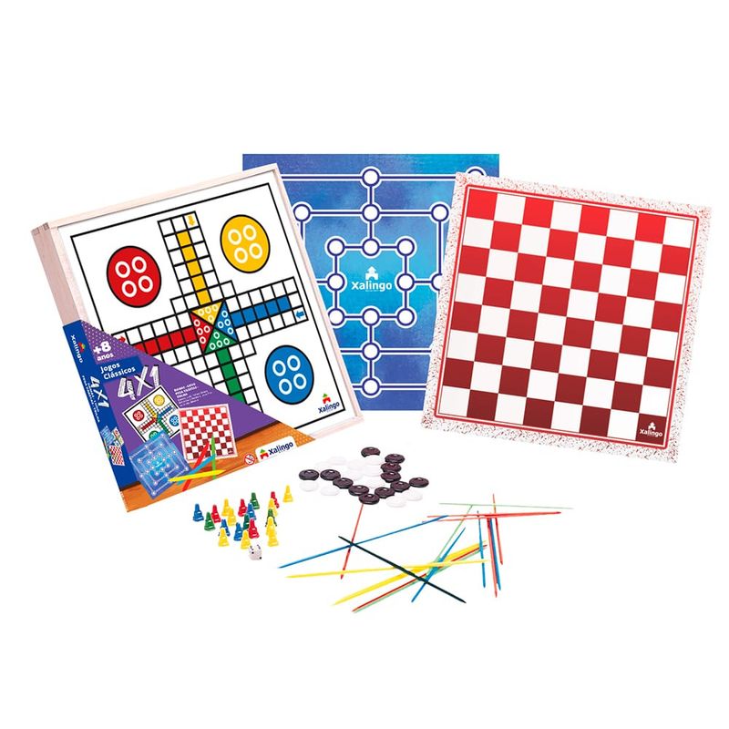 Jogo Infantil 4 em 1 com Peças em Plástico - Xalingo A alegria e a emoção estarão completas com o Jogo 4 em 1 da Xalingo! Os jogos são: ludo, damas, trilha e pega varetas da Xalingo com design clássico, sendo todas as suas peças fabricadas em plástico injetado de altíssima qualidade, durabilidade e resistência contra quebras ou deformações com ótimo acabamento sem nenhuma rebarba, além do estojo em madeira pinus com tampa e fundo em Duratree, maior durabilidade, assim garantindo um brinquedo em estado de novo por muito mais tempo. Tabuleiros pintado em tinta atóxica (Não Tóxica). Este brinquedo contribui no desenvolvimento da coordenação motora, pensamento lógico, imaginação, criatividade da crianças e o lazer entre os amigos e familiares. Informações Técnicas: Indicação de Idade:Apartir de 4 Anos Medidas: 31 x 4 x 31 cm ?Produto? DADOS TÉCNICOSRef.: 65576Idade Recomendada: + 6 AnosDimensões aproximadas da embalagem: 31 x 4 x 31 CmCódigo de Barras: 7896640465575IN METRO: CE-BRI/SGS N-0078-76 NM 300/2002 Garantia: Contra Defeitos de Fabricação Todas as informações divulgadas são de responsabilidade do fabricante/fornecedor.Imagens Meramente Ilustrativas.Observe atentamente a idade recomendada para o brinquedo. Pode conter partes pequenas que podem ser engolidas e perigosas