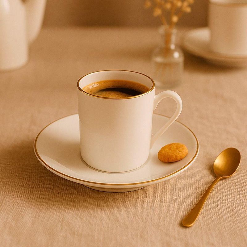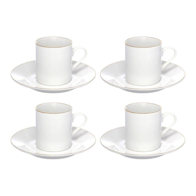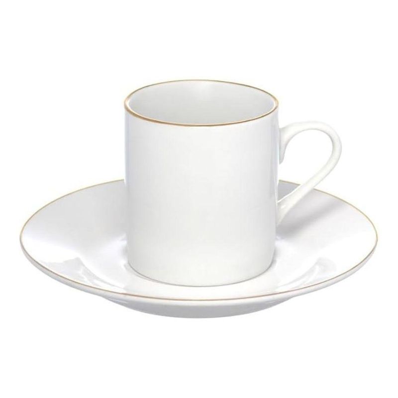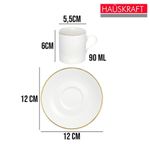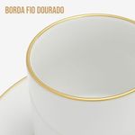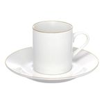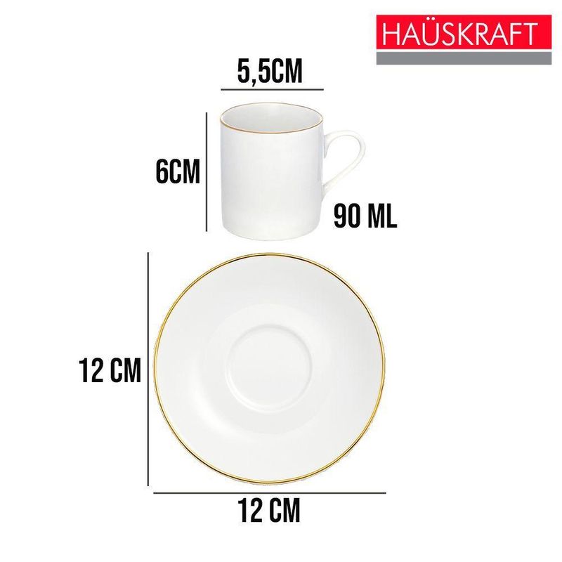 Jogo 4 Xícara De Café Porcelana Borda Dourada Com Pires Royal Premium 90ml HaüskraftJogo 4 Xícara de Café Porcelana Borda Dourada com Pires Royal Premium 90ml HaüskraftConjunto para servir café composto por xícara de 90ml e pires, ambos fabricados em porcelana. A porcelana oferece resistência a variações térmicas, permitindo o uso com bebidas quentes e facilitando a higienização. A pintura dourada na borda da xícara e do pires adiciona uma camada protetiva, reduzindo o desgaste nessas áreas de contato.O formato cilíndrico da xícara, aliado à sua espessura, contribui para a conservação da temperatura da bebida. O pires apresenta uma cavidade central projetada para encaixar a xícara, proporcionando maior estabilidade e minimizando o risco de deslizamentos. A alça da xícara, com design curvo, facilita o manuseio e oferece uma pegada delicada.Xícara de Café Porcelana Borda Dourada com Pires Royal Premium 90ml HaüskraftCódigo: 126453Referênica: JGXC082Marca: HaüskraftMaterial: PorcelanaCor: BrancaDimensões do produto (AxLxC): 6,00x5,50x5,50cm cada unidadeQuantidade: Kit com 4 unidades