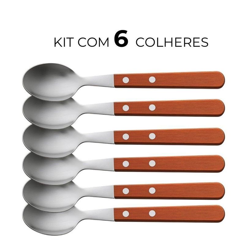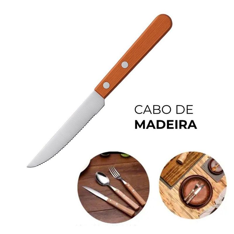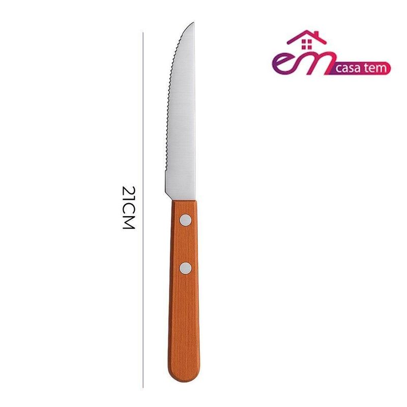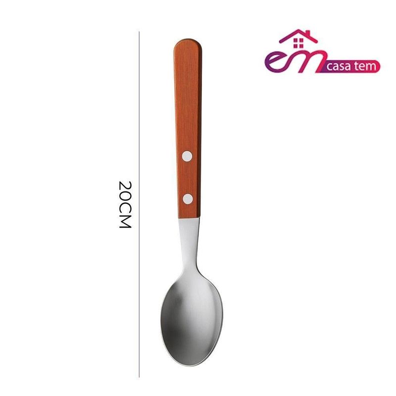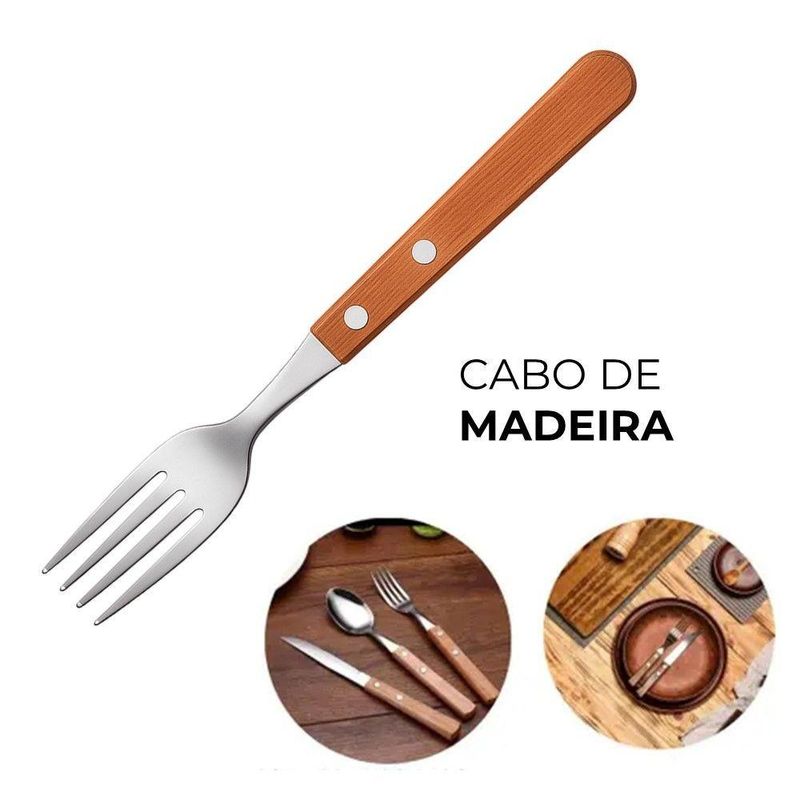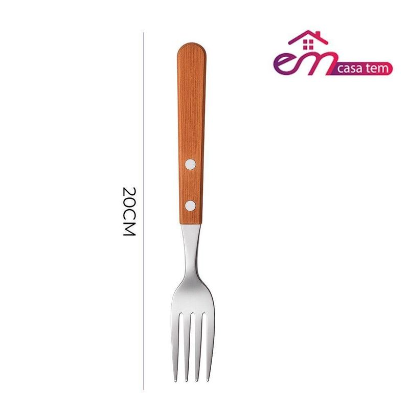 Jogo 6 Garfos 6 Colheres E 6 Facas Cabo De Madeira Churrasco Astana 20cm Em Casa TemJogo 6 Garfos 6 Colheres e 6 Facas Cabo de Madeira Churrasco Astana 20cm Em Casa TemO kit vem com:6 Garfos6 Facas6 ColheresEste conjunto é composto por seis garfos , seis colheres e seis facas, ideais para refeições diárias e ocasiões especiais. A construção equilibra funcionalidade e design, oferecendo um talher durável e confortável para o uso.Cada garfo possui lâminas em aço inoxidável, que conferem resistência à corrosão e facilitam a limpeza. O cabo de madeira proporciona uma pegada firme e confortável, além de adicionar um toque de elegância à peça. A combinação de materiais garante a durabilidade do conjunto, mesmo com uso frequente.Benefícios funcionais:- Resistência à corrosão: Lâminas em aço inoxidável prolongam a vida útil do produto.- Manuseio confortável: Cabo de madeira com design que facilita a utilização.- Facilidade de limpeza: Materiais que simplificam a higienização após o uso.- Estética: A combinação de aço inox e madeira contribui para uma mesa mais agradável.- Conjunto completo: Seis unidades para atender às necessidades do dia a dia.Conteúdo do Kit:Jogo 6 Garfos Cabo de Madeira Churrasco Astana 20cm Em Casa TemCódigo: 127038Marca: EmCasaTemMaterial: Aço e MadeiraDimensões do produto (AxLxC): 20,00x4,00x2,00cm cada unidadeQuantidade: 1 unidadeJogo 6 Facas Cabo de Madeira Churrasco Astana 21cm Em Casa TemCódigo: 127036Marca: EmCasaTemMaterial: Aço e MadeiraDimensões do produto (AxLxC): 21,00x2,00x2,00cm cada unidadeQuantidade: 1 unidadeJogo 6 Colheres de Sopa Cabo de Madeira Churrasco Astana 20cm Em Casa TemCódigo: 127035Marca: EmCasaTemMaterial: Aço e MadeiraDimensões do produto (AxLxC): 20,00x4,00x2,00cm cada unidadeQuantidade: 1 unidade