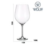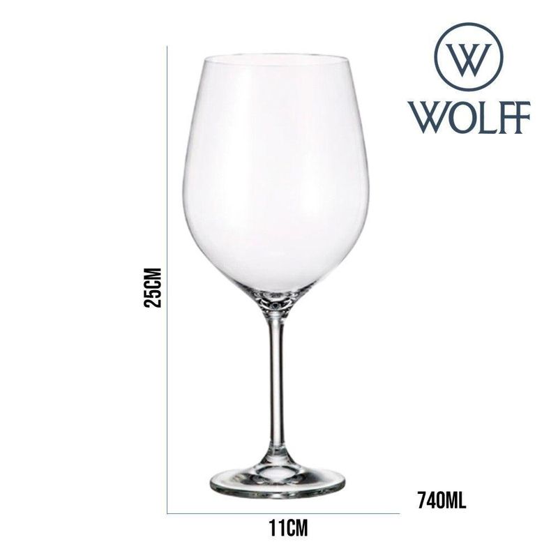 Jogo 6 Taça Para Vinho Tinto 740ml Em Cristal Transparente WolffJogo 6 Taça para Vinho Tinto 740ml em Cristal Transparente WolffIdeal para quem valoriza elegância e bom gosto na hora de servir.Cada taça possui capacidade para 740ml, permitindo uma melhor apreciação dos aromas e sabores do vinho.Fabricadas em cristal de alta qualidade, oferecem brilho, transparência e resistência para o uso diário ou ocasiões especiais.As dimensões de cada taça são 25cm de altura por 11cm de diâmetro, proporcionando presença e equilíbrio à mesa.O design clássico e sofisticado favorece a oxigenação da bebida, tornando a experiência de degustação ainda mais completa.Esse conjunto é a escolha perfeita para compor uma mesa refinada e impressionar seus convidados com estilo.Taça para Vinho Tinto 740ml em Cristal Transparente WolffCódigo: 126998Referênica: 35779Marca: WolffMaterial: CristalCor: TransparenteDimensões do produto (AxLxC): 25,00x11,00x11,00cm cada unidadeQuantidade: Kit com 6 unidadesSobre a marca:Há mais de um século a Wolff foi fundada na Alemanha e há 85 anos mudou-se definitivamente para o Brasil dando continuidade à oferta de produtos de extremo requinte e beleza. Com tecnologia de ponta aliada ao cuidado e ao toque habilidoso do artesão, a Wolff desenvolve peças que se destacam pela elegância e design apurado, o que a torna referência no mercado de luxo.