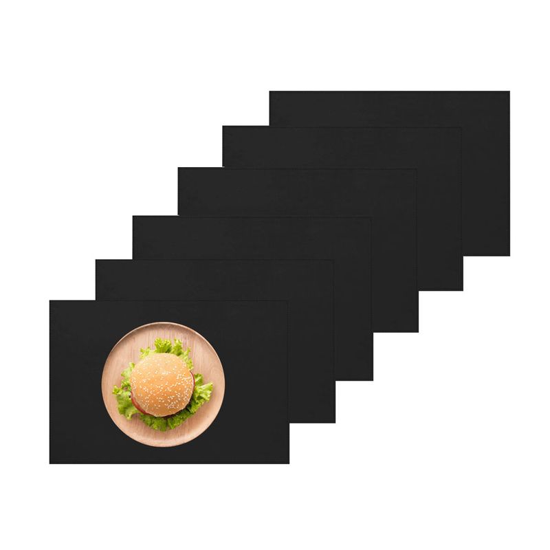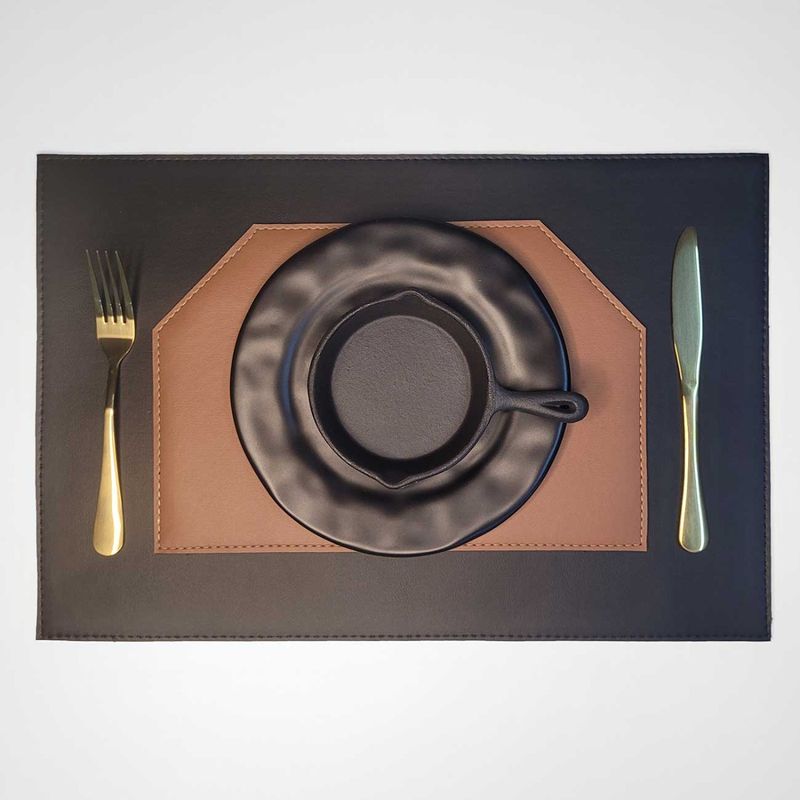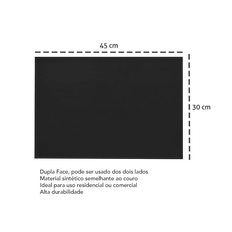 Jogo Americano Dupla Face composto por material sintético semelhante ao couro. Excelente acabamento e super versátil, podendo usar dos dois lados. Fácil de limpar é ideal para mesa de jantar, ou usar em escritórios como suporte de mesa. A textura do material é o grande diferencial, proporcionando aos ambientes requinte, sofisticação e praticidade. Para manter a durabilidade do produto, passar um pano úmido, não alvejar e não secar em tambor. Contêm: Jogo Americano (6 peças) Dimensões: 30 x 45 cm Material: Sintético