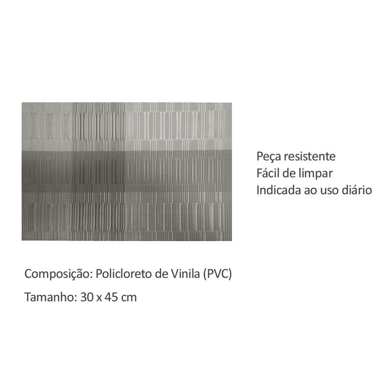 Jogo americano retangular. Os jogos americanos sao praticos e substituem a toalha de mesa. Perfeito para todas as ocasioes sao confeccionados em PVC, o que torna o material mais resistente e facil de limpar. Contem: Lugar Americano - 4 peças Medidas: 30 x 45 cm Composiçao: 100% Policloreto de Vinila (PVC)