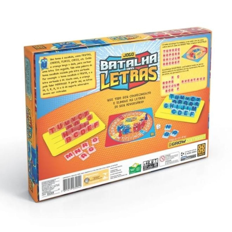No Jogo Batalha Das Letras da Grow, a criança deverá usar todo o seu conhecimento para eliminar as letras do seu adversário.Escolha um tema, como frutas, carros, flores, cores e etc...Em seguida lançar o dado para sortear uma letra, com a letra sorteada, fale uma palavra iniciada por ela. Por exemplo: o tema escolhido é fruta e a letra sorteada é M, neste caso, a criança pode falar morango.A partir dai, as letras da palavra morango devem ser retiradas do suporte adversário.