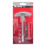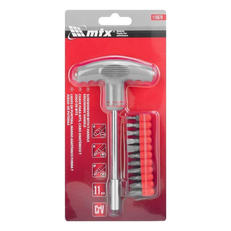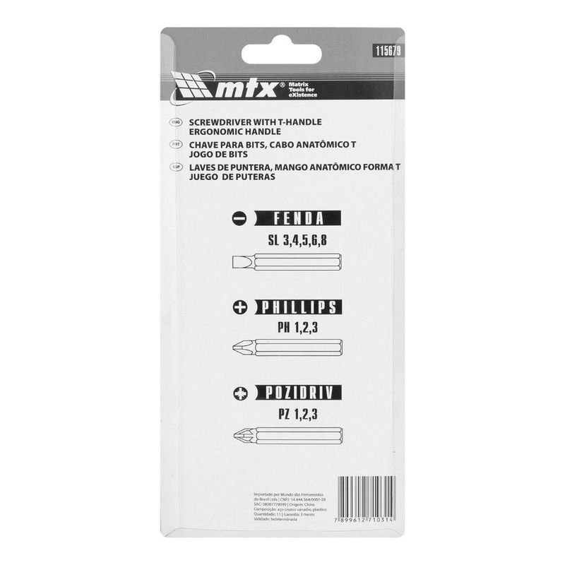 Jogo Bits Mtx 11 Peças Cabo T Cromo Vanádio 53 HrcJogo de Bits com Cabo Anatômico em T Cromo Vanádio 11 Peças MTX: Precisão e DurabilidadeA Chave de Fenda MTX 115679 redefine a experiência de apertar e soltar parafusos, combinando design ergonômico com a robustez do aço cromo-vanádio. Este jogo de 11 bits, com cabo em forma de T, oferece versatilidade e conforto para tarefas domésticas e reparos. O suporte com conexão hexagonal permite trocas rápidas de bits, adaptando-se a diversas necessidades. Inclui bits com ranhuras PH, PZ e SL, os tamanhos mais utilizados, tornando-o a solução ideal para o dia a dia. Os bits são fabricados em aço cromo-vanádio com dureza de 53 HRC, garantindo resistência superior e longa vida útil. O cabo em forma de T proporciona maior torque com menos esforço, enquanto a superfície estriada e os recortes para os dedos oferecem uma pegada segura e confortável, mesmo durante trabalhos prolongados. O suporte de placa integrado mantém os bits organizados e acessíveis, evitando perdas e facilitando a seleção do bit correto. Invista na Chave de Fenda MTX 115679 e tenha a ferramenta perfeita para montagem de móveis, ajustes em eletrodomésticos e pequenos reparos. Especificações Material das pontas: Aço carbono Material do cabo: T Cromo Vanádio Quantidade de peças: 11 Tipos de pontas: SL/PH/PZ Dureza dos bits: 53 HRC Itens Inclusos Jogo de Bits com Cabo Anatômico em T MTX 115679 Suporte para os bits Perguntas Frequentes (FAQ) Pergunta: Qual o material dos bits?Resposta: Os bits são fabricados em aço cromo-vanádio, garantindo alta durabilidade e resistência. Pergunta: O cabo é ergonômico?Resposta: Sim, o cabo em forma de T possui superfície estriada e recortes para os dedos, proporcionando maior conforto e segurança no uso. Pergunta: Este jogo de bits é compatível com outras marcas?Resposta: Sim, a chave de fenda MTX 115679 é universalmente compatível com bits de outros fabricantes. Pergunta: Qual a garantia do produto?Resposta: Garantia legal: 90 dias Produto: Jogo | Tipo de Produto: Jogo