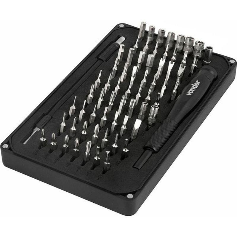 Jogo Bits/ponteira Crv Com 66 Peças Precisao - VonderConteúdo da Embalagem:1 Jogo de bits/ponteiras de precisão, composto por um estojo plástico com travas imantadas, com 66 peças, sendo: 1 cabo adaptador em alumínio 4 mm (5/32') com apoio giratório, 1 extensão flexível, 7 soquetes sextavados com encaixe de 4 mm (2,5 mm, 3 mm, 3,5 mm, 4 mm, 4,5 mm, 5 mm e 5,5 mm), 1 adaptador 1/4 x 4 mm, 11 bits sextavados (0,7 mm, 0,8 mm, 1,3 mm, 1,5 mm, 2,0 mm, 2,5 mm, 3,0 mm, 3,5 mm, 4,0 mm, 4,5 mm e 5,0 mm), 3 bits tipo U (4 mm, 6 mm e 8 mm), 3 bits quadrados (Nº 0, Nº 1 e Nº 2), 4 bits phillips (J000, J00, J0 e J1), 4 bits hexalobular sem guia (T2, T3, T4 e T5), 8 bits hexalobular com guia (TR6, TR7, TR8, TR9, TR10, TR15, TR20, TR25), 2 soquetes multidentados com encaixe de 4 mm (G 3,8 mm e G 4,5 mm), 1 bits SIM (redondo), 6 bits fenda (1,0 mm, 1,5 mm, 2,0 mm, 2,5 mm, 3,0 mm e 4 mm), 4 bits tipo Y (Y000, Y00, Y0 e Y1), 3 bits estrela (P2, P5 e P6), 5 bits phillips (PH000, PH00, PH0, PH1 e PH2) e 2 bits triangulares (2 mm e 3 mm)Descrição:Jogo de bits/ponteiras de precisão, com 66 peças, encaixe sextavado de 4 mm, VONDERAplicações e dicas de uso:Indicado para uso geral em trabalhos de precisãoDestaques e diferenciais:Possui vários modelos de bits, aumentando as possibilidades de uso, e extensão flexível que facilita o trabalho em lugares de difícil acessoCaracterísticas Técnicas:Material do Bits ponteira: Aço cromo vanádio Acabamento do Bits: Cromado Tipo do encaixe do bits: sextavado 4 mmGarantia legal: 90 dias Tipo de Produto: Furadeira/Parafusadeira | É kit de Fábrica: Sim | Tipo de ferramenta: Elétrico