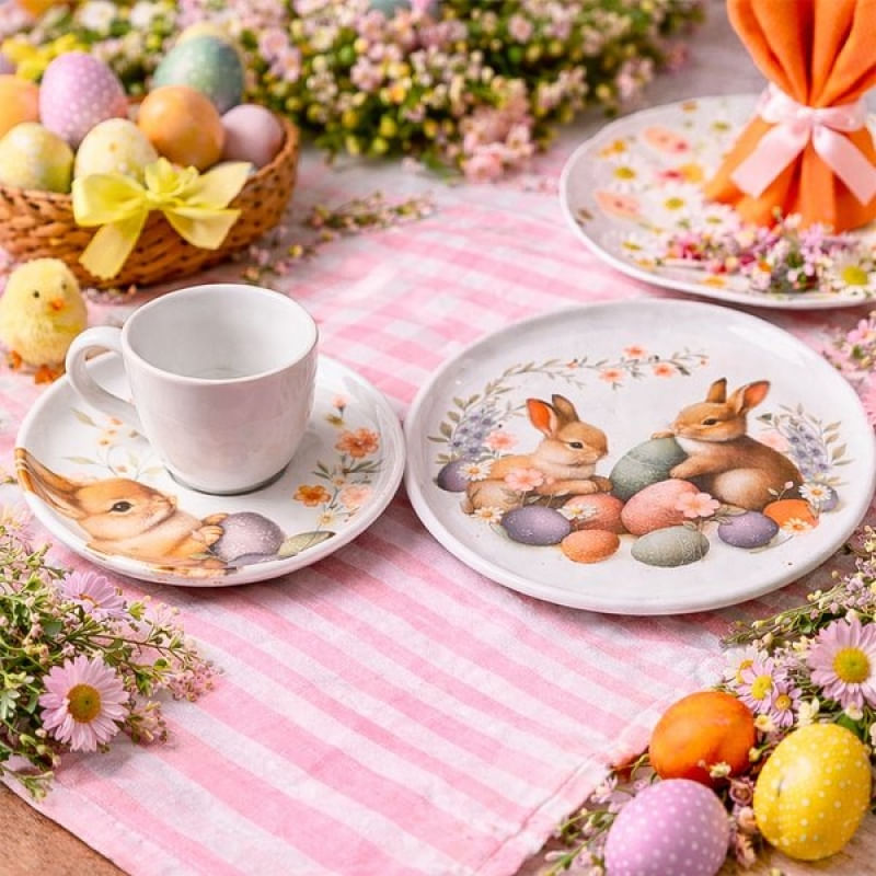 Jogo Café Lanche Doce Ninho Coelhinho Páscoa 24pç 12 Pessoas - Delicada e encantadora, a linha Doce Ninho celebra a ternura e o aconchego da Páscoa Com flores em tons suaves e coelhinhos rodeados por ovos e folhagens, as peças criam uma atmosfera acolhedora e cheia de charme Perfeitas para servir café com afeto, as xícaras e pires tornam cada pausa mais especial, transformando o simples ato de servir em um gesto de carinho Produzidas em stoneware de alta performance Porto Brasil, as peças combinam resistência, durabilidade e design autoral Características dos produtos: Medidas: Xícara 6,5cm x 6,9cm / Pires 13,5cm / Prato 2cm x 21,5cm Capacidade: 120ml Ideal para café e chá Tema Páscoa / Doce Ninho Design delicado e decorativo Conteúdo da pacote: 12x Jogo de xícaras com pires Bio Doce Ninho Páscoa 120ml 12x Jogo de pratos sobremesas Bio Doce Ninho páscoa 21,5cm Características Gerais do Produto: • Material: Cerâmica • Modelo: Bio Doce Ninho • Cor: Branco • Dimensões aproximadas: Xícara 6,5cm x 6,9cm / Pires 13,5cm / Prato 2cm x 21,5cm • Capacidade em litros: 120ml Garantia: • Garantia do site - 1 Mês