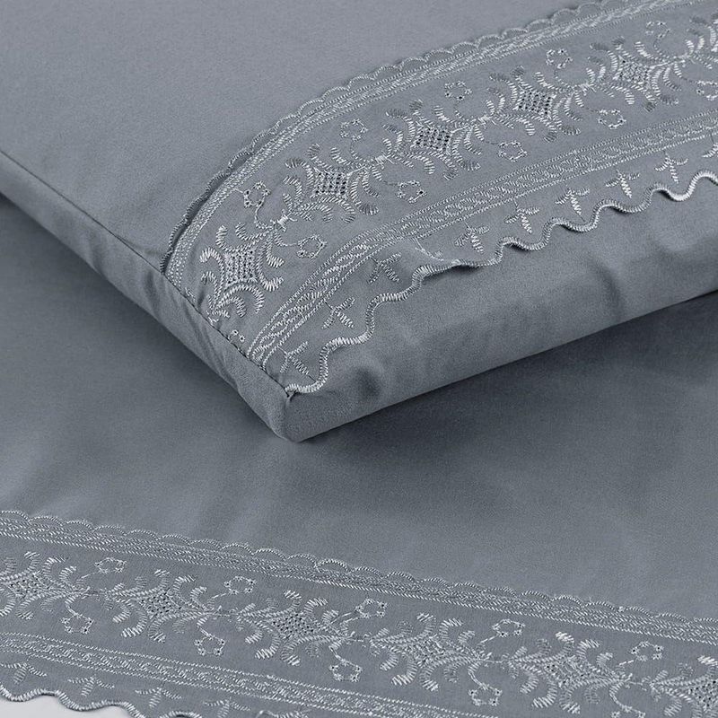Jogo Cama Casal Cherry Bordado Inglês 4pç 100% Poliéster - CinzaO Jogo de lençol para cama Casal Padrão com 04 peças confeccionado em tecido Micropercal 200 fios, detalhes em bordado inglês na fronha e no lençol de cima. Possui alto padrão de qualidade, proporciona conforto e sofisticação.Contém na embalagem:01 Lençol superior Comp (2,50m) x Larg (2,25m)01 Lençol de baixo com elástico (2,50m) x (2,25m) para colchão de (1,88m)x(1,38cm)x(30cm)02 Fronhas Comp (70cm) x Larg (50cm)*Observações: Considere as medidas e formatos especificados na descrição do produto.* DECORAÇÃO LUXUOSA DE ALTO PADRÃOComposição: 100% Poliéster*As fotos são meramente ilustrativas.*As cores podem variar de acordo com cada monitor e não representam todas as peças que compõem a descrição do produto.*Fique atento à descrição do produto.