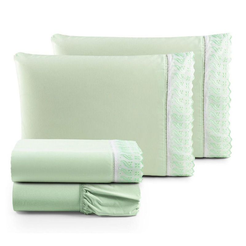 Jogo Cama Lençol Paris Queen Percal 180 Fios 100% Algodão Lese Bordada 4 Peças - VerdeTransforme seu quarto em um verdadeiro refúgio de conforto e elegância com nosso Jogo de Lençol Paris com Lese Bordada, confeccionado em Percal 180 fios 100% algodão. Este conjunto premium é a escolha ideal para quem busca sofisticação e qualidade em cada detalhe.Características:Material: Percal 180 fios 100% algodão, proporcionando maciez e durabilidade excepcionais.Detalhe: Delicada lese bordada, adicionando um toque de charme e requinte ao seu enxoval.Conforto: Tecido respirável e suave ao toque, garantindo noites de sono mais confortáveis e revigorantes.Durabilidade: Alta resistência e fácil manutenção, mantendo a beleza e integridade das peças por muito mais tempo.Praticidade no Dia a Dia:- Fácil de lavar e secar, é ideal para quem busca praticidade no dia a dia.- O Lençol de baixo com elástico em toda a volta garante um ajuste perfeito ao seu colchão, sem amassar ou sair do lugar durante a noite. Diga adeus aos lençóis que se enrolam e desajeitam!Contém na embalagem:01 Lençol de Cima 2,50m x 2,40m01 Lençol de Baixo c/ Elástico 2,50m x 2,20m p/ colchão 1,98m X 1,58m X 30cm alt.02 Fronhas 70cm x 50cmComposição:Tecido - 100% Algodão - Percal 180 FiosAs fotos são meramente ilustrativas. As cores podem variar de acordo com cada monitor e não representam todas as peças que compõem a descrição do produto. Fique atento à descrição do produto.