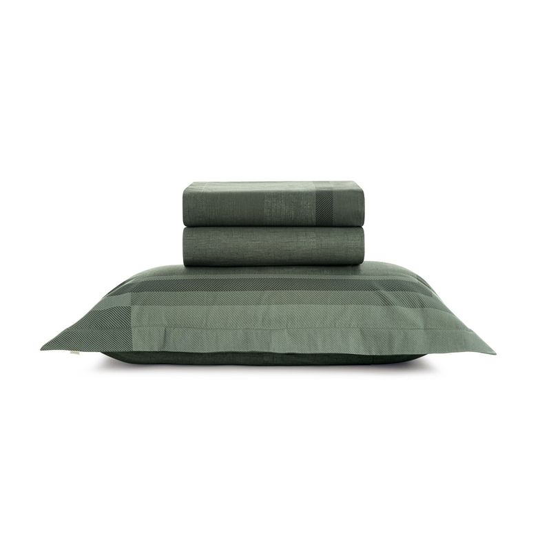 Descrição: Textura, tons de verde imponentes e um mix de formas geométricas se unem no jogo de cama Ícaro. As linhas retas e formas combinadas criam um padrão visual sofisticado. As fronhas são dimensionadas e formam uma moldura que valoriza a composição da cama. Confeccionado em algodão 200 fios, oferece toque agradável, visual marcante e versatilidade. Ideal para quem busca uma cama atual, com design e identidade fortes. Cuidados Lave tipos de tecidos distintos separadamente; Não lave cores claras e cores escuras no mesmo ciclo; Lave as peças no ciclo leve, suave ou delicado de sua lavadora; Enxágue as peças com bastante água; Utilize a quantidade mínima de amaciante e sabão; Leia atentamente as instruções na etiqueta. Especificações do produto Atributos: Sobre lençol estampado com dobra feita; Lençol com elástico estampado; Fronha dimensionada com 4 abas de 4cm e etiqueta da marca aplicada Descrição Visual: Lençol de elástico em tom verde escuro com textura. Fronhas com estampado dimensionado emoldurando a fronha com linhas em tons de verde e sobrelençol com estampado listrado verde Quantidade de Fios: 200 Fios Quantidade de Peças: 3 Peças Composição: 100% Algodão Tamanho: Solteiro Itens Inclusos:1 Lençol de Elástico; 1 Sobrelençol; 1 Fronha Medida Sobrelençol: 1,80m x 2,50m; Lençol de Elástico: 1,00m x 2,00m x 35cm; Fronha: 50cm x 70cm Acabamento:Estampado Observações:Pode haver pequena variação de cor, de acordo com a configuração e modelo do monitor ou do aparelho celular. Consultar a cor nas especificações técnicas do produto.
