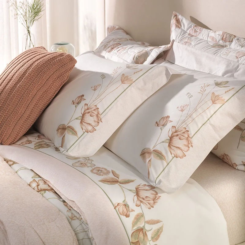Jogo de Cama Solteiro 200 Fios 100% Algodão Mariê: Transforme seu quarto com o conforto e a elegância do Jogo de Cama Solteiro Mariê. Feito em 100% algodão 200 fios, este jogo oferece um toque macio e encorpado, além de ser altamente respirável, hipoalergênico e antipilling para maior durabilidade e cuidado com a pele. O conjunto inclui um sobre lençol tinto com vira dimensionada e bainha de 10cm com medidas 1,80m x 2,50m, um lençol com elástico estampado de 1,00m x 2,00m x 35cm e duas fronhas 50cm x 70cm dimensionadas com elegantes abas de 7cm. Com sua estampa floral em tons rosas e beges, o jogo de Cama Mariê adiciona um toque delicado e sofisticado à decoração do ambiente. Combine com o jogo de colcha ou edredom da mesma linha, ou peças de tonalidades similares, para criar um visual harmonioso. Toque soft 200: O Toque Soft da Karsten abraça você com o mais puro algodão 200 fios feitos com fio penteado 100% brasileiro. Mais encorpado e macio, reduz o atrito com a pele, sendo altamente respirável e ajudando a regular a temperatura corporal. Com ação antipilling e hipoalergênico, oferece durabilidade e cuidado para peles sensíveis. Perfeito para quem busca noites tranquilas e um toque de sofisticação no dia a dia. Karsten: cuidado e aconchego em cada detalhe. Coleção Instantes: Para acompanhar seus melhores momentos, a coleção Instantes da Karsten, vem com cores delicadas e detalhes que agregam valor aos seus momentos com o toque do puro algodão junto de tecnologias de produção de ponta para entregar produtos de qualidade. Viva cada momento com o conforto e aconchego que a Karsten busca proporcionar em sua vida e aprecie cada segundo do seu bem-estar e da sua família. Especificações do produto Altura do Lençol: 35cm Quantidade de Peças: 3 Peças Estilo: Casual Tamanho: Solteiro Cor: Bege Composição: 100% Algodão Tipo: Estampado Itens Inclusos: 1 Lençol com Elástico; 1 Sobre lençol; 1 Fronha Acabamento: Sobre lençol tinto com vira dimensionada com bainha de 10cm; Lençol com elástico estampado; Fronha dimensionada com 3 abas de 7cm; Mais encorpado e macio; Altamente respirável; Antipilling e Hipoalergênico Instruções de Lavagem: Lavação a 60ºC; Proibido alvejar; Secar em tambor com temperatura maxima de 60ºC; Ferro de passar com temperatura maxima de 150ºC; Proibido lavar a seco Outras Observações: Pode haver pequena variação de cor, de acordo com a configuração e modelo do monitor ou do aparelho celular. Consultar a cor nas especificações técnicas do produto. Combinação de Cores: Fronha com estampa dimensionada com moldura de riscado nas abas; lençol de elástico com riscado delicado e sobre lençol com dobra feita estampada/ Quem somos: "A Belladomi é uma loja estabelecida desde 2013, especializada em oferecer uma ampla variedade de produtos para melhorar o conforto e a acolhida de lares. Com um compromisso firme com a qualidade, cada item selecionado reflete esse padrão elevado. Trabalhando com marcas reconhecidas, a Belladomi assegura excelência em todas as peças, mantendo preços competitivos na região. Sua equipe se destaca pelo atendimento diferenciado, disponível para auxiliar em todas as etapas da compra, garantindo uma experiência satisfatória para o cliente. Seu objetivo é contribuir para a tornar as casas mais aconchegantes e elegantes, oferecendo produtos de alta qualidade a preços justos."