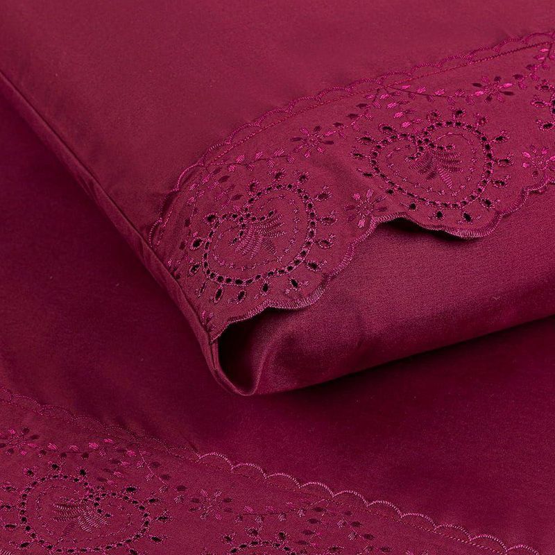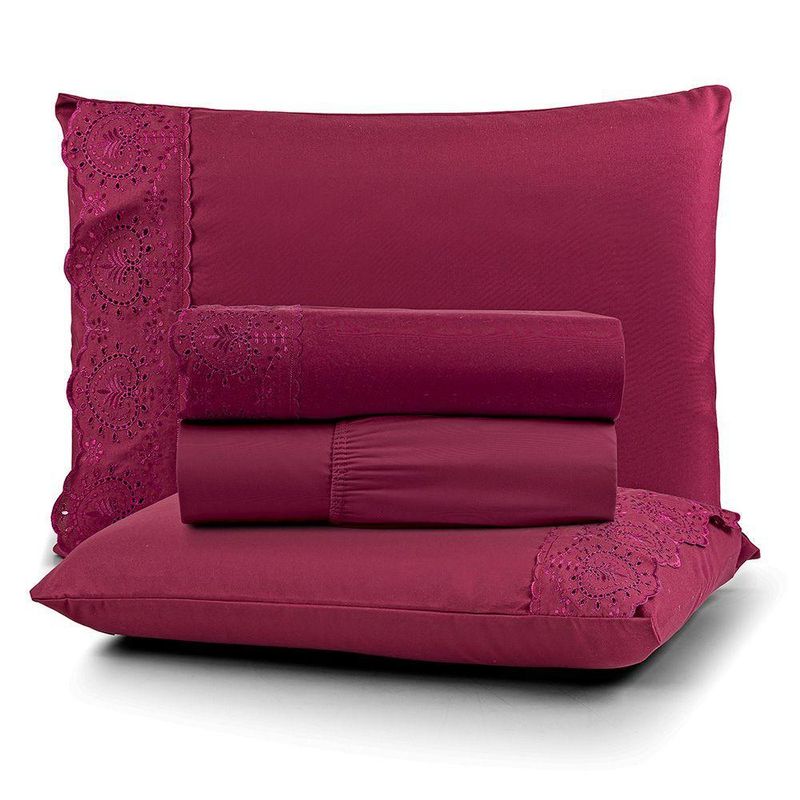Jogo Cama Solteiro Cherry Bordado Inglês 3pç 100% Poliéster - BordoO Jogo de lençol para cama Solteiro com 03 peças confeccionado em tecido Micropercal 200 fios, detalhes em bordado inglês na fronha e no lençol de cima. Possui alto padrão de qualidade, proporciona conforto e sofisticação.Contém na embalagem:01 Lençol superior Comp (2,40m) x Larg (1,60m)01 Lençol de baixo com elástico (2,50m) x (1,50m) para colchão de (1,88m)x(0,88cm)x(30cm)01 Fronhas Comp (70cm) x Larg (50cm)*Observações: Considere as medidas e formatos especificados na descrição do produto.* DECORAÇÃO LUXUOSA DE ALTO PADRÃOComposição: 100% Poliéster*As fotos são meramente ilustrativas.*As cores podem variar de acordo com cada monitor e não representam todas as peças que compõem a descrição do produto.*Fique atento à descrição do produto.