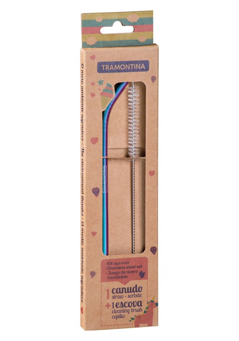 Jogo Canudos Tramontina Infantil Furta-Cor Aço Inox Escova 2 Peças Tramontina - Para saborear as suas bebidas com mais cor e estilo utilize o Jogo de Canudo Tramontina Infantil Furta-Cor em Aço Inox com Escova 2 Peças. Esse canudo além de ser fabricado totalmente em aço inoxidável reutilizável, material é altamente durável e resistente, tornando esse item ecológico por poder ser reutilizado várias vezes sem riscos de prejudicar a eficácia do material. Canudo em aço inoxidável reutilizável.Totalmente feito de aço inox, por isso não solta nenhum resíduo.Altamente durável mantém suas características originais, preservando a beleza, a higiene e a durabilidade do material. Material de alta resistência, não enferruja, não transfere odor e nem gosto.Ideal para cocktails, refrigerantes e sucos. Design curvado moderno, inovador e compacto, sendo facilmente levado a qualquer lugar.Acompanha escova de limpeza.Fácil de limpar.Pode ser utilizado para bebidas frias ou quentes.Canudo Furta-Cor. Observações Para a limpeza do canudo, utilizar a escova de nylon que acompanha o produto, para que o alcance da higienização seja de 100%.Não lavar com materiais abrasivos, após o uso lavar com esponja macia e sabão neutro, guardar o produto seco.Pode ser lavado em máquina de lavar louças. Características Gerais EAN13 7891116155370 DUN14 17891116155377 NCM 7323.93.00 0,0170 kg. 0,0170 kg. Metragem 0,000150 m³. 59x 212x 12 mm. 59x 212x 12 mm. Características Gerais do Produto: Garantia: • 1 Ano