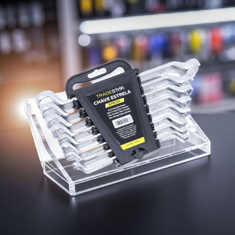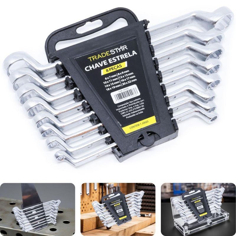 Jogo Chave Estrela 6 - 22 Mm 8 Peças Aço Carbono TradestarKit Chave Estrela Tradestar 6 mm até 22 mm 8 Peças Cromo VanádioO Kit de Chaves Estrela Tradestar 8 Peças é a solução ideal para profissionais e entusiastas que buscam precisão, resistência e praticidade no trabalho com porcas e parafusos sextavados. Fabricadas em Cromo Vanádio de alta qualidade, estas chaves oferecem durabilidade, firmeza e confiabilidade, suportando o uso contínuo em tarefas industriais ou domésticas.Este conjunto inclui 8 chaves de medidas duplas: 6x7 mm, 8x9 mm, 10x11 mm, 12x13 mm, 14x15 mm, 16x17 mm, 18x19 mm e 20x22 mm. Essa ampla variedade garante versatilidade para diferentes aplicações, permitindo que você tenha a ferramenta certa sempre à mão.As chaves tipo estrela são projetadas para envolver completamente a cabeça do parafuso ou porca, oferecendo um torque mais eficiente e seguro, reduzindo o risco de arredondamento ou desgaste das peças. Seu design proporciona maior firmeza no encaixe, tornando o trabalho mais rápido e preciso.O formato ergonômico das chaves permite manuseio confortável, ideal para trabalhos prolongados sem esforço excessivo. O acabamento em Cromo Vanádio também garante resistência à corrosão, aumentando a vida útil do kit.O Kit de Chaves Estrela Tradestar é indicado para mecânicos, montadores, eletricistas, profissionais de manutenção e qualquer usuário que precise de ferramentas confiáveis e resistentes em suas tarefas diárias. Seja em oficinas, na construção civil ou em casa, este conjunto oferece performance profissional em todas as situações.Especificações- Medidas: 6x7 mm / 8x9 mm / 10x11 mm / 12x13 mm / 14x15 mm / 16x17 mm / 18x19 mm / 20x22 mm- Quantidade de peças: 8 unidades- Acabamento: Tratamento especial contra oxidação- Uso: Aperto e soltura de porcas e parafusos sextavadosItens inclusos- 1 Jogo Chave Estrela 6-22 mm 8 Peças Cromo VanádioGarantia- 03 meses com o Fabricante NA