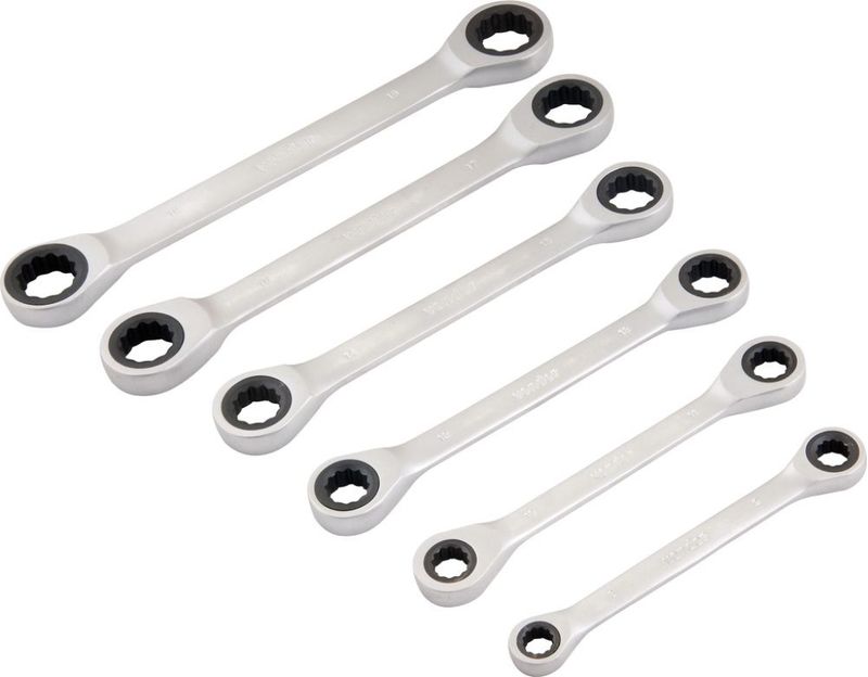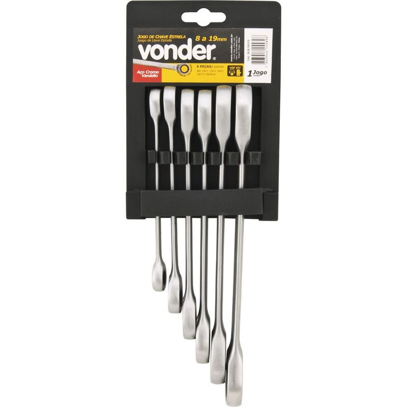 Conteúdo da embalagem1 Jogo de chaves estrela, composto por um estojo plástico com 6 peças, sendo: 8 mm x 9 mm, 10 mm x 11 mm, 12 mm x 13 mm, 14 mm x 15 mm, 16 mm x 17 mm e 18 mm x 19 mmAplicações e dicas de usoIndicado para apertar e soltar porcas e parafusos sextavados. Nunca utilizar prolongadores sobre as chaves, pois isso aumentará o torque aplicado e diminuirá a vida útil das ferramentas. Não indicado para dar o aperto final.Destaques e diferenciaisProduzido em aço cromo vanádio, proporcionando maior resistência e durabilidade. Possui acabamento cromado fosco que aumenta a proteção contra oxidação/corrosão. Com sistema de catraca que possibilita apertar e soltar parafusos e porcas sem necessidade de retirar a chave, proporcionando a realização de trabalhos com mais facilidade e agilidade. Conta com mais pontos de fixação que proporcionam uma distribuição uniforme da força aplicada na parte central do sextavado, evitando deformação dos cantos das porcas e parafusos. DETALHES TÉCNICOS Material do corpo da chave: Aço cromo vanádio Acabamento da Chave: Cromado fosco Conteúdo: 8 mm x 9 mm, 10 mm x 11 mm, 12 mm x 13 mm, 14 mm x 15 mm, 16 mm x 17 mm e 18 mm x 19 mm