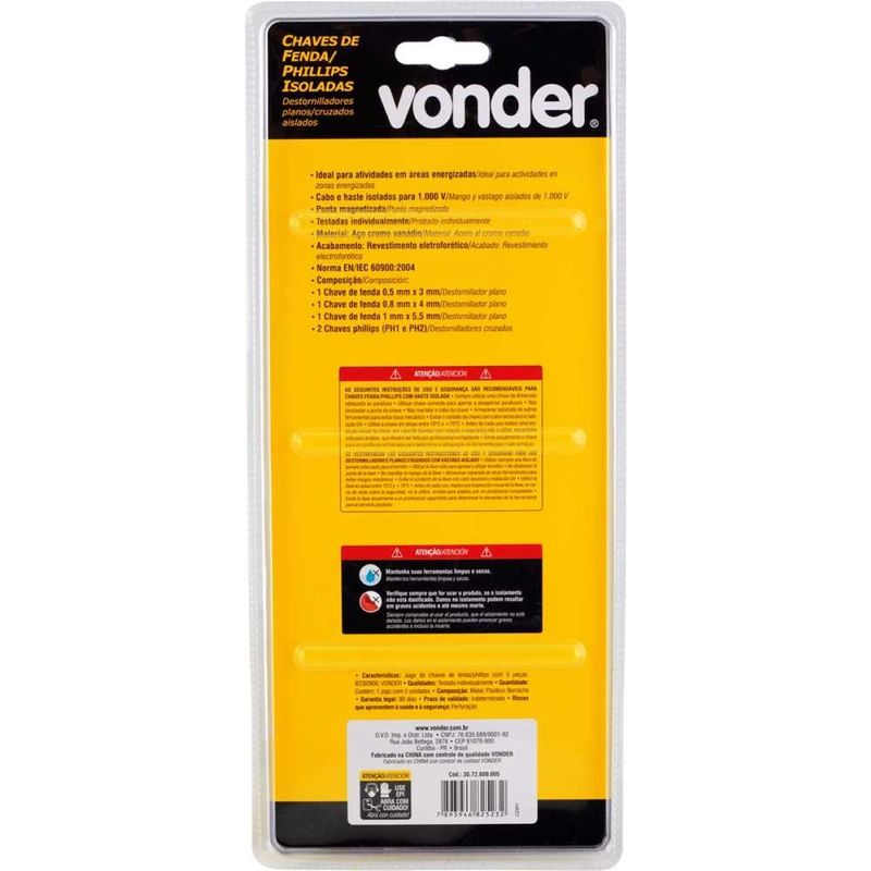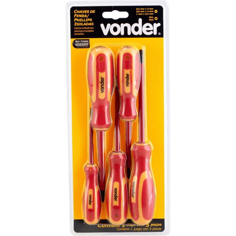 Código do Fornecedor: 3072609005Marca: Vonder Conteúdo da embalagem: 1 Jogo Chave Fenda/Phillips Isolada 1000V 5 Peças LEC60900 VonderDestaques e diferenciais: Atende norma internacional EN/IEC 60900:2004. Cabo e haste isolados para 1.000 V. Chaves testadas individualmente. Com formato anatômico que proporciona melhor manuseio.Aplicações e dicas de uso: Indicada para fixar e soltar parafusos de fenda/phillips. Ideal para atividades em áreas energizadas.Garantia legal: 90 diasDetalhes TécnicosQuantidade: 5 peças Material do jogo de chave fenda e phillips: CrV Material do cabo: Polipropileno com borracha Acabamento do jogo de chave de fenda e phillips: Revestimento eletroforético Tensão de isolação (V): 1.000 V Cor do cabo da chave: Vermelho e amarelo Certificação: IEC 60900 Atende norma: EN/IEC 60900:2004 Massa aproximada (peso) (kg): 0,380 kg