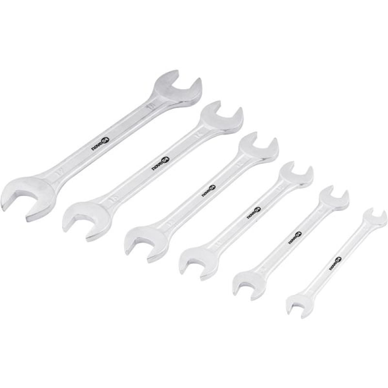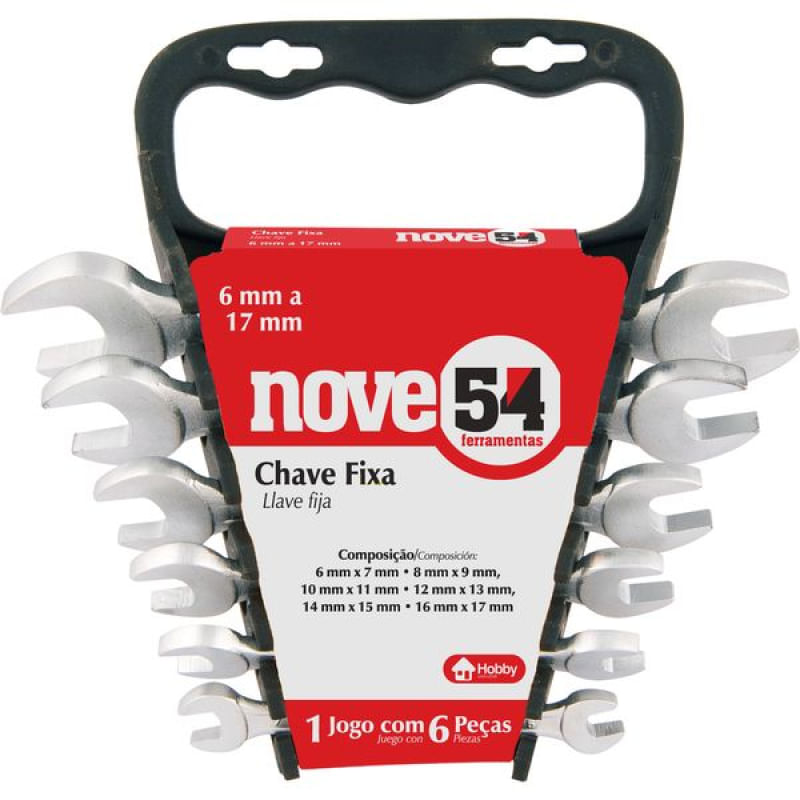 Conteúdo da embalagem1 Jogo de chaves fixas, composto por um suporte plástico com 6 peças, sendo: 6 mm x 7 mm, 8 mm x 9 mm, 10 mm x 11 mm, 12 mm x 13 mm, 14 mm x 15 mm e 16 mm x 17 mmAplicações e dicas de usoIndicado para apertar e soltar porcas e parafusos sextavados. Nunca utilizar prolongadores sobre as chaves, pois isso aumentará o torque aplicado e diminuirá a vida útil das ferramentas. Uso leve.Destaques e diferenciaisCorpo das chaves com acabamento cromado fosco, proporcionando maior resistência contra oxidação/corrosão. Possuem pontas estreitas que possibilitam o uso em locais de difícil acesso. DETALHES TÉCNICOS Material do corpo da chave: Aço carbono Acabamento da Chave: Cromado fosco