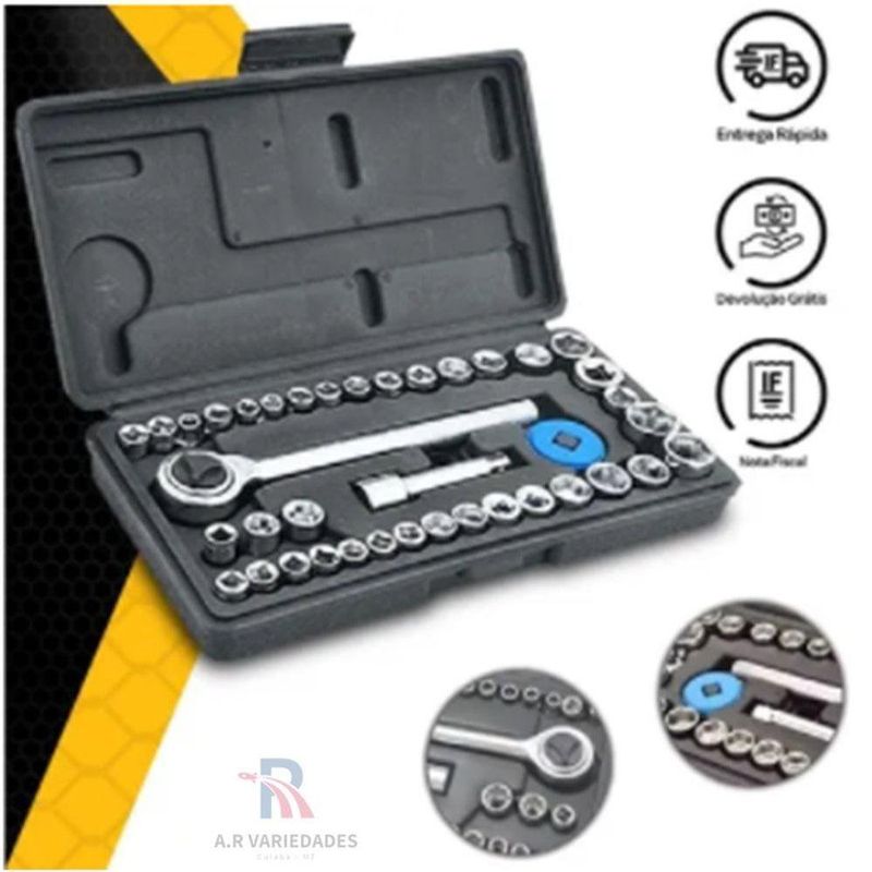 Jogo Chave Soquete C/ Catraca 40 Pçs Soquete Para Tudo Kit Chaves Jogo Catraca Reversível Soquetes 40 Peças MaletaUm excelente produto para uso hobby ou doméstico, feito em Aço Carbono. CARACTERÍSTICAS:- Fabricados em Aço com acabamento cromado- Acompanha maleta plástica resistente para acomodação e transporte das peças- Indicado para sempre ter em mãos a ferramenta certa para qualquer ocasião