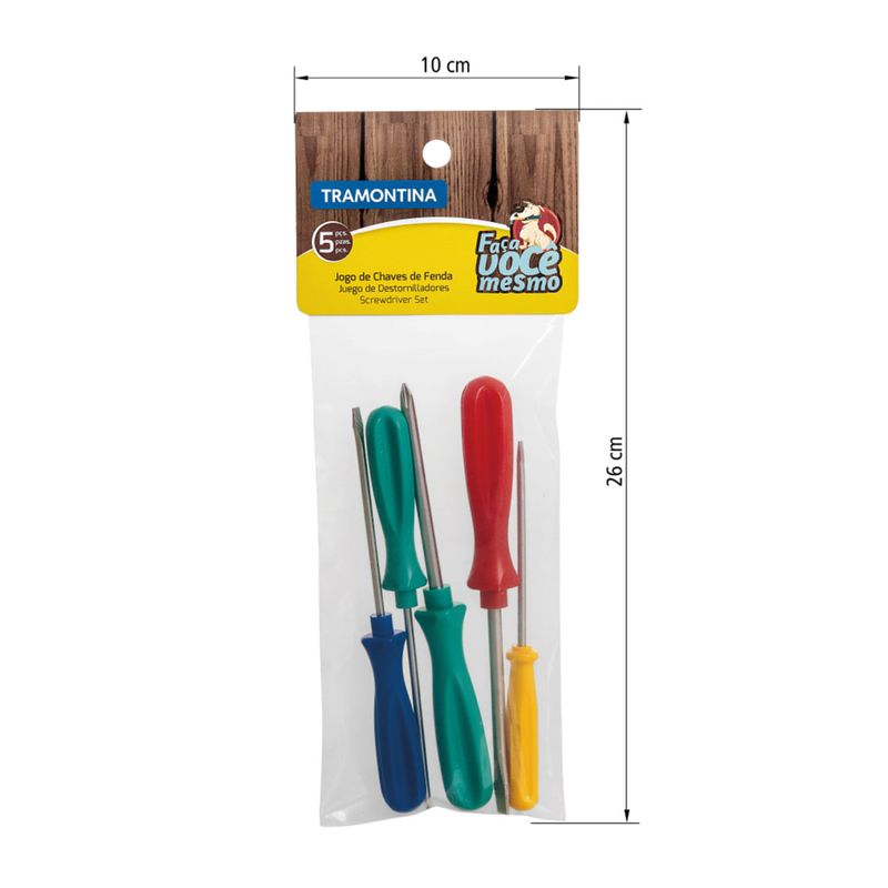 Precisando apertar ou afrouxar parafusos? Escolha a chave de bitola adequada e pode colocar a mão na massa. Com as chaves da Tramontina, quem passa aperto é o parafuso. - As hastes as chaves de fenda são testadas em máquinas de ensaio específicas, para verificar o perfeito balanço entre resistência mecânica e dureza. - Cabos injetados com material de alta resistência. - Os dimensionais das pontas são verificados com gabaritos-padrão, calibrados e certificados. - As ferramentas são produzidas y testadas conforme normas específicas. Orientação Geral: - Use óculos, luvas e outros equipamentos de proteção de acordo com a tarefa a ser executada. - Utilize chaves de fenda isoladas, identificadas pela marcação 1.000 V, quando for necessário trabalhar em locais com corrente elétrica. Importante: nestes casos, inspecione a integridade da isolação elétrica, e, se aparecerem trincas na isolação, suspenda o uso imediatamente. - Utilize chaves com ponta adequada para cada tipo de fenda, para realizar a tarefa de forma mais rápida e segura. - Respeite o torque estabelecido por norma para cada bitola. - Não utilize as chaves de fenda como formão ou alavanca. - Não altere as dimensões originais da ponta para obter outro perfil. - Armazene em local limpo e seco. Composição: 01 un. Chave de fenda clipe 1/8x3" 01 un. Chave de fenda ponta chata 1/8x3" 01 un. Chave de fenda ponta chata 3/16x3" 01 un. Chave de fenda ponta cruzada 1/8x3" 01 un. Chave de fenda ponta cruzada 3/16x3" Fabricante: Tramontina